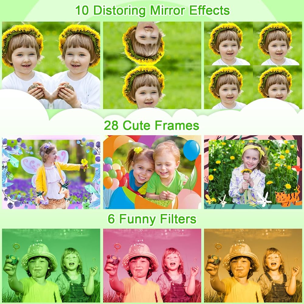 【كاميرا أطفال متعددة الوظائف】تحتوي كاميرا الأطفال على وظائف متعددة، صور، فيديو، تسجيل صوتي، تقريب رقمي 4X، تصوير متتابع، ألعاب وما إلى ذلك. يوجد 15 إطار صور لطيف و6 مرشحات للاختيار. يمكن للأطفال الذين تتراوح أعمارهم بين 4 و8 سنوات اختيار الإطارات المفضلة لديهم قبل التقاط الصور. رائعة لتطوير الإبداع والخيال لدى الأطفال.