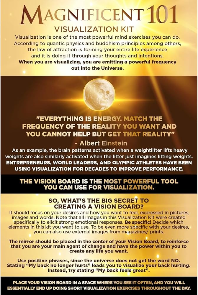 • مجموعة لوحة رؤية قوية للبالغين (4 × 6 انش) - اصنع لوحة تعرض رؤية نجاحك الشخصية. ضعه في مكان تراه كثيرًا وسوف ينتهي بك الأمر إلى القيام بتمارين التصور كل يوم.