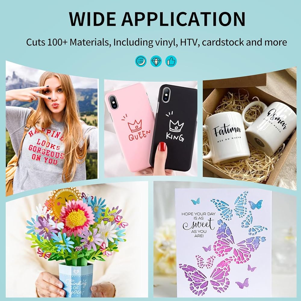 🌞【COMPATIBLE WITH 100 plus MATERIALS】 The LOKLiK cutting machine is compatible with multiple materials. Our vinyl cutter machine is equipped with an upgraded motor and the advanced “Print Then Cut” feature, which can make precise, intricate cuts variety of materials from a variety of popular materials like cardstock, vinyl decals, HTV iron-on, glitter paper, Infusible Ink, etc. A great cutting machine for HTVRONT heat transfer vinyl, for HTVRONT permenent vinyl, for HTVRONT cutting mat and more.