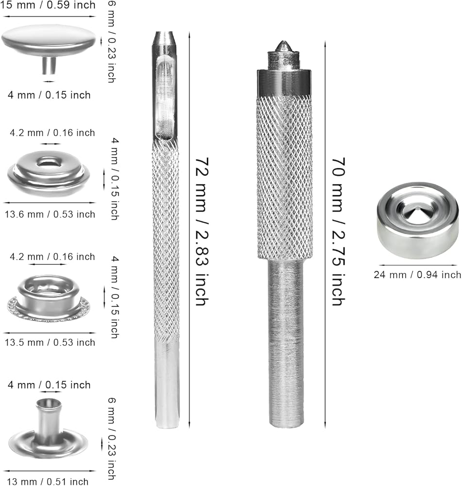 حجم المنتج: غطاء الزر: قطر 15 مم/0.59 بوصة؛ مقبس الزر: قطر 13 مم/0.5 بوصة؛ المنشور: 11.5x6 مللي متر/0.45x0.24 بوصة ؛ مسمار: 13x4 مللي متر/0.5x0.16 بوصة. يرجى التحقق من حجم منتجاتنا بعناية قبل الشراء.