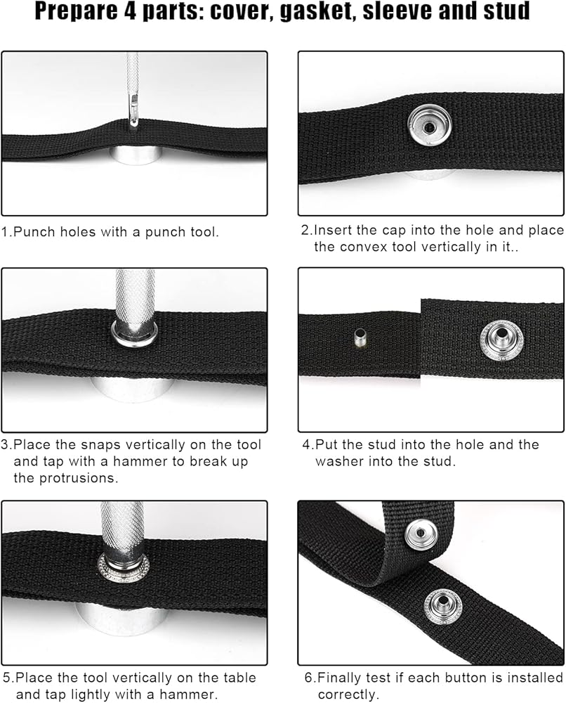 كيفية التثبيت: 1. جهز مطرقة (غير متضمنة)، ضع غطاء الزر على قاعدة الإعداد؛ 2. استخدم الثقب والمطرقة المجوفة لعمل ثقب في قطعة واحدة من الجلد؛ 3. قم بتمرير عمود غطاء الزر من خلال موضع التثقيب، ثم ضع مقبس الزر على غطاء الزر؛ 4. استخدم أداة مقعرة ومطرقة للنقر بقوة؛ 5. قم بثقب قطعة أخرى من الجلد بنفس الطريقة، وقم بتمرير العمود من خلال موضع التثقيب؛ 6. ضع المسمار على العمود، وأخيرًا استخدم أداة مقعرة ومطرقة للنقر عليها بقوة.