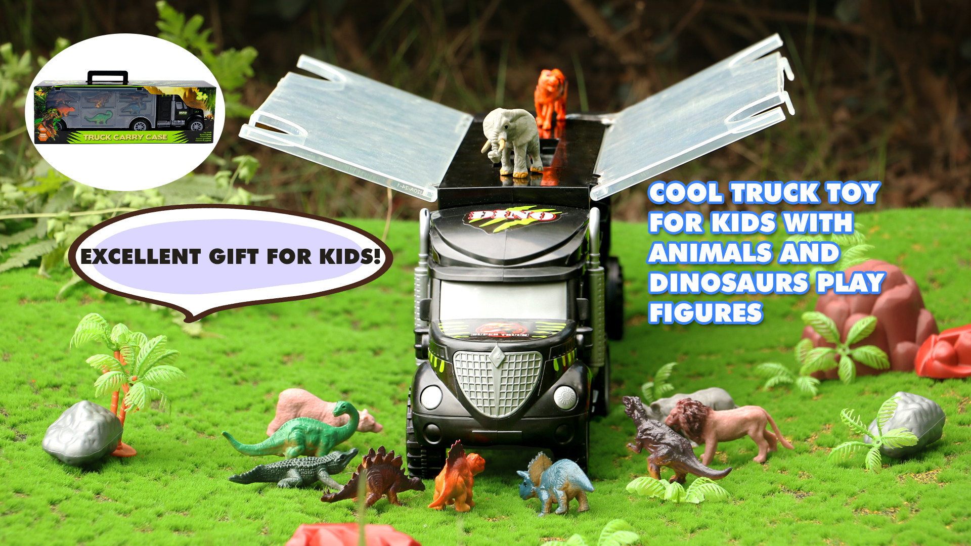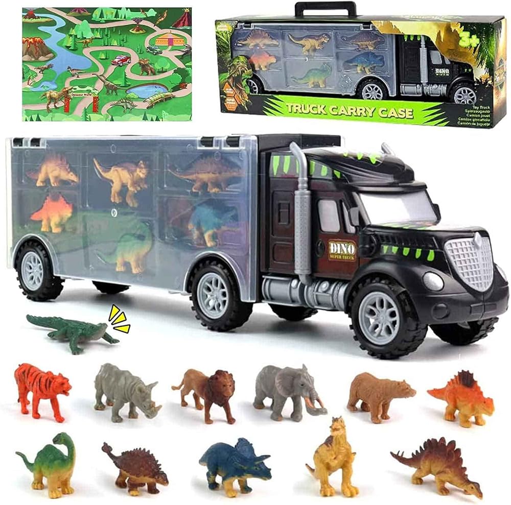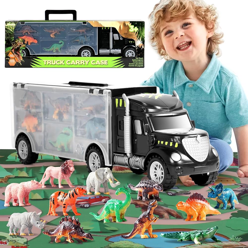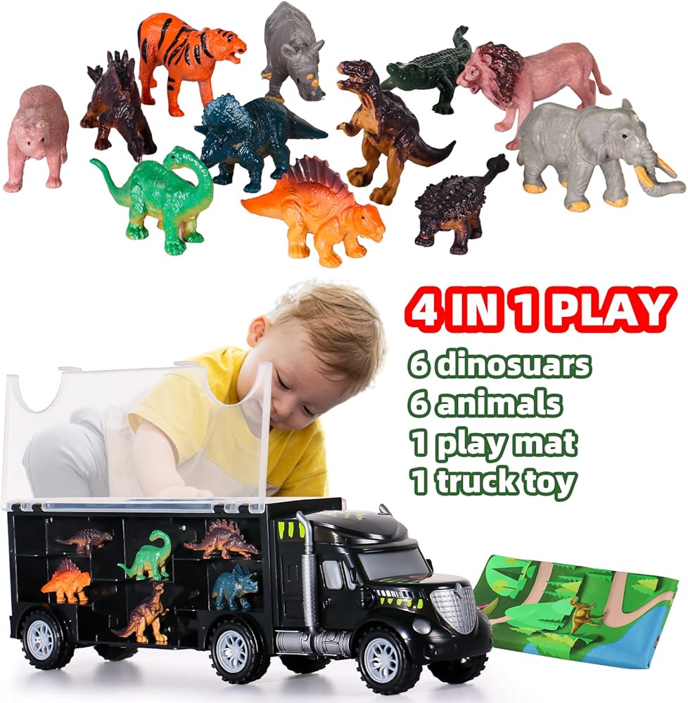 🚚【ألعاب ديناصور 4 في 1 للأطفال من سن 3 إلى 5 أولاد وبنات】اشترِ ألعاب الأطفال الصغار هذه على شكل شاحنة الديناصورات = احصل على عشرات الطرق للعب للأطفال. تحتوي مجموعة ألعاب الديناصورات للأطفال على 12 مخلوقًا للأطفال لملء أي دور من لعبة مغامرة حديقة الحيوان أو الديناصورات. يمكن للأطفال سحب سيارات الألعاب أو دفعها للخلف، مما يقود المخلوقات إلى عالم الديناصورات الذي يصنعونه، ويتفاعل مع الحيوانات وديناصورات ما قبل التاريخ مع بساط اللعب للأنشطة.