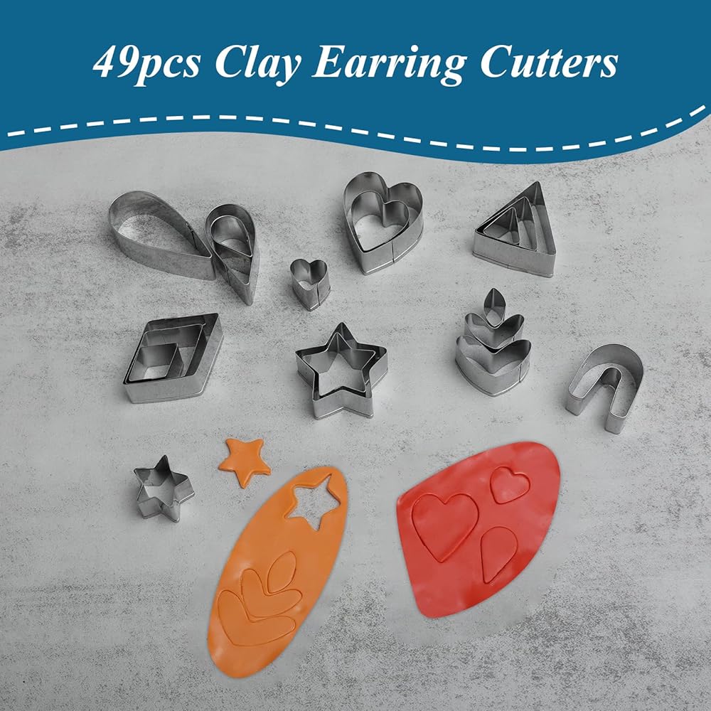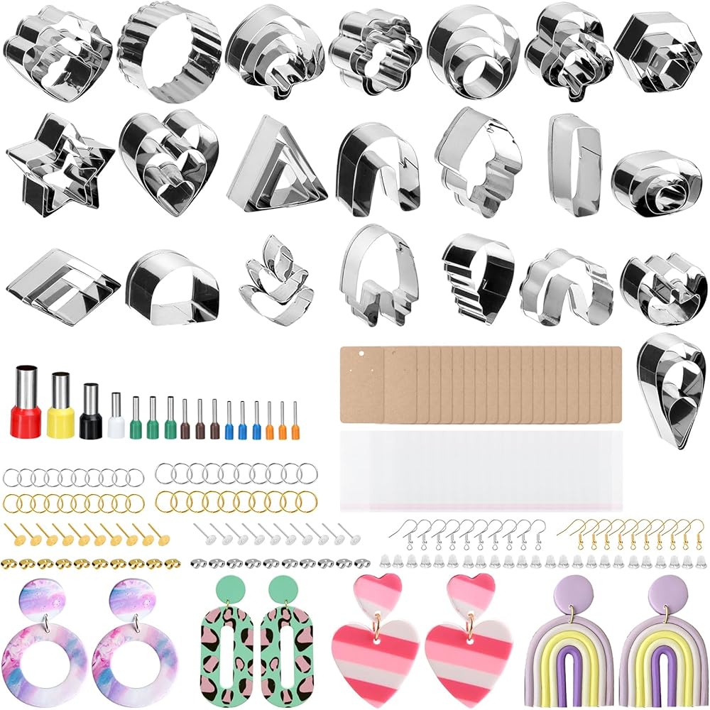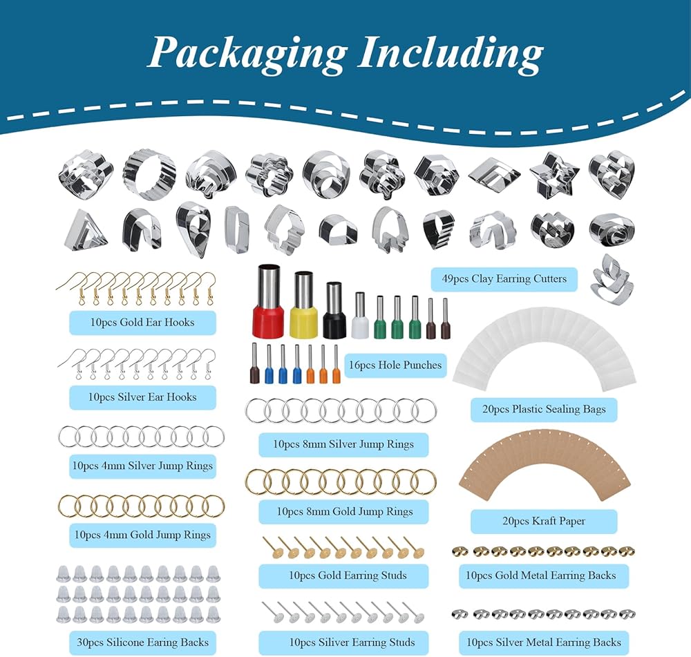 مجموعة صنع الأقراط الطينية الكل في واحد: تتضمن مجموعة قطع طين البوليمر MADLYN RHUE 49 قاطعة طين في أشكال دائرية، بيضاوية، مثلث، زهرة، قلب، U، إلخ، 16 ثقبًا، 20 بطاقة قرط كرافت، 20 بلاستيك أكياس إغلاق، 10 خطافات أقراط ذهبية و10 فضية، 10 حلقات القفز ذهبية وفضية مقاس 4 مم و8 مم، 30 ظهر أقراط من السيليكون، 10 أقراط ذهبية و10 أقراط فضية، 10 أقراط معدنية ذهبية و10 فضية.