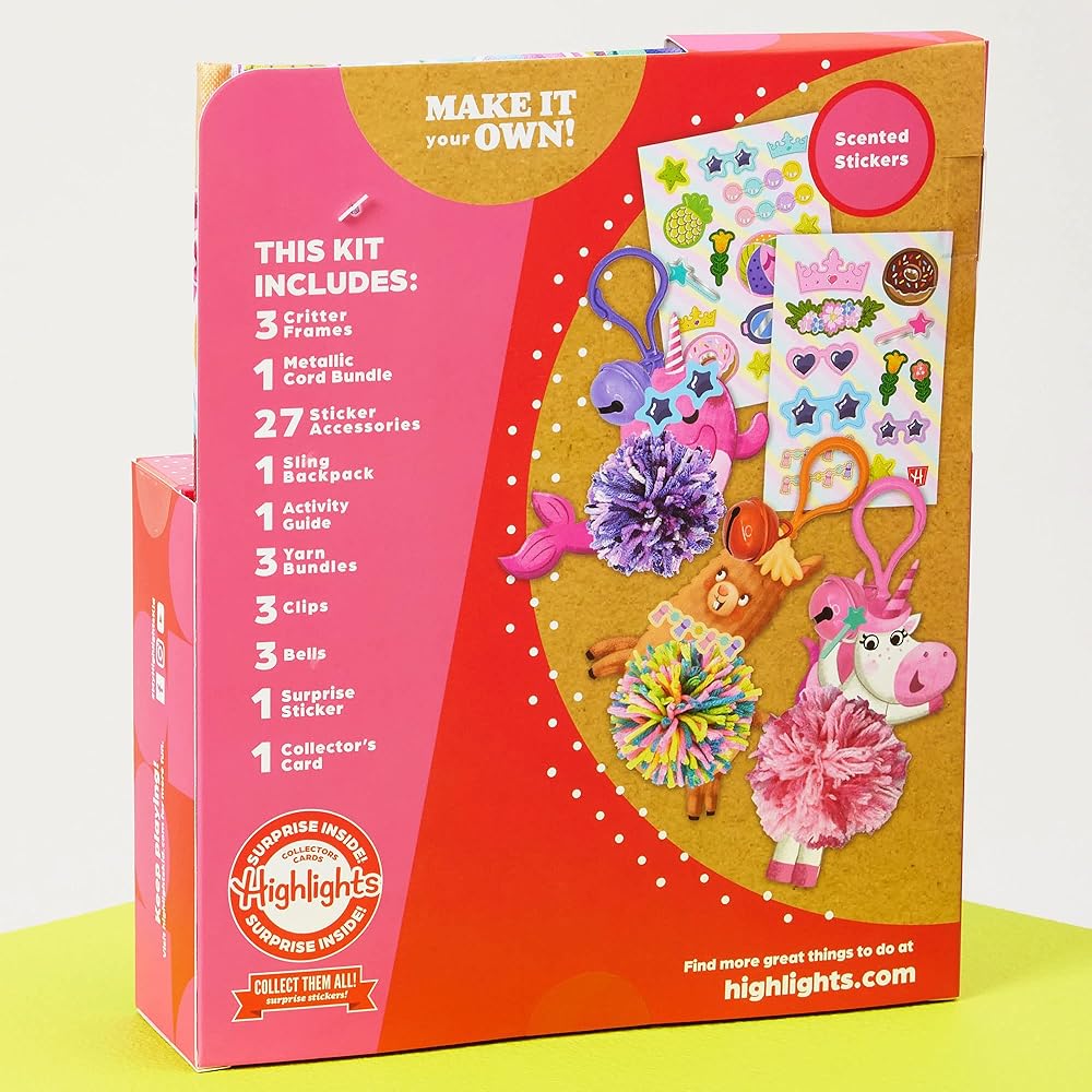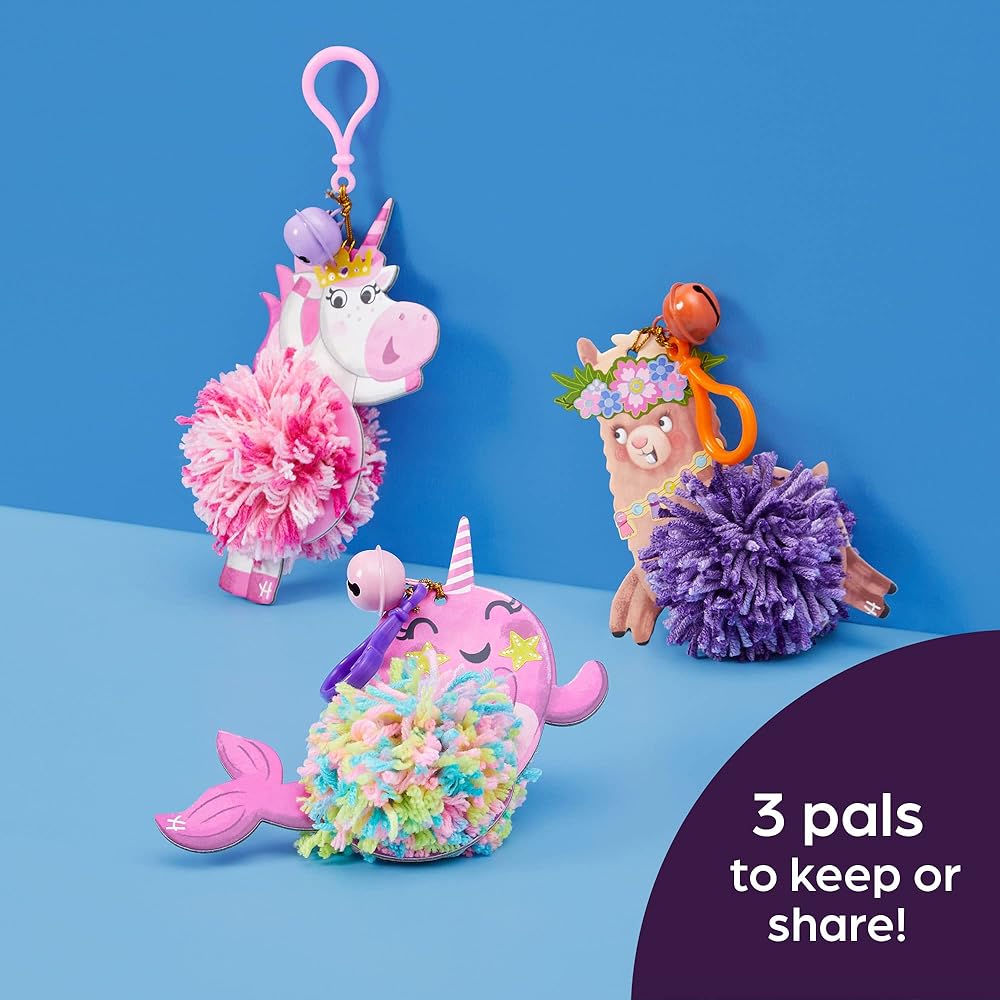 حرفة بومبوم بدون خياطة - قم بإنشاء وتخصيص مشابك حقيبة سلسلة المفاتيح السحرية باستخدام خيوط ملونة وملصقات خدش وشم وأجراس جلجل ممتعة؛ تأتي هذه المجموعة مع كل ما يحتاجه الأطفال لصنع وتزيين 3 كرات بوم بوم بال، بالإضافة إلى حقيبة ظهر بحمالة والمزيد من المفاجآت بالداخل