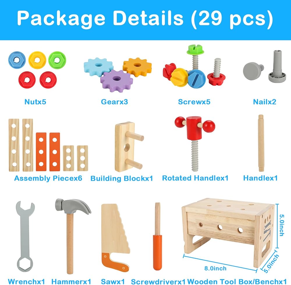 مجموعة أدوات Vextronic للأطفال، 29 قطعة مجموعة أدوات لعبة مونتيسوري الخشبية للأطفال الصغار 1-3-5 2-4 مع صندوق الأدوات/المقعد، مجموعة أدوات اللعب التظاهري، بناء تعليمي STEM هدية عيد ميلاد للأولاد والبنات