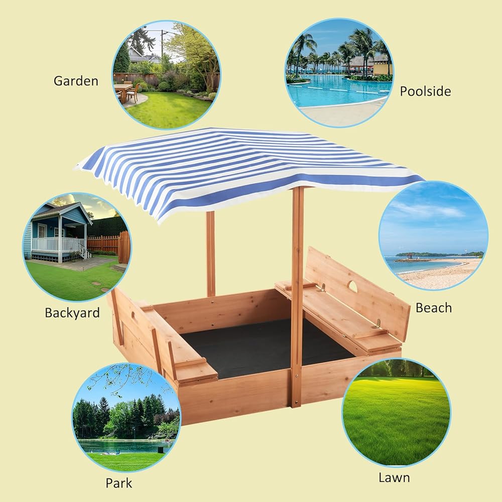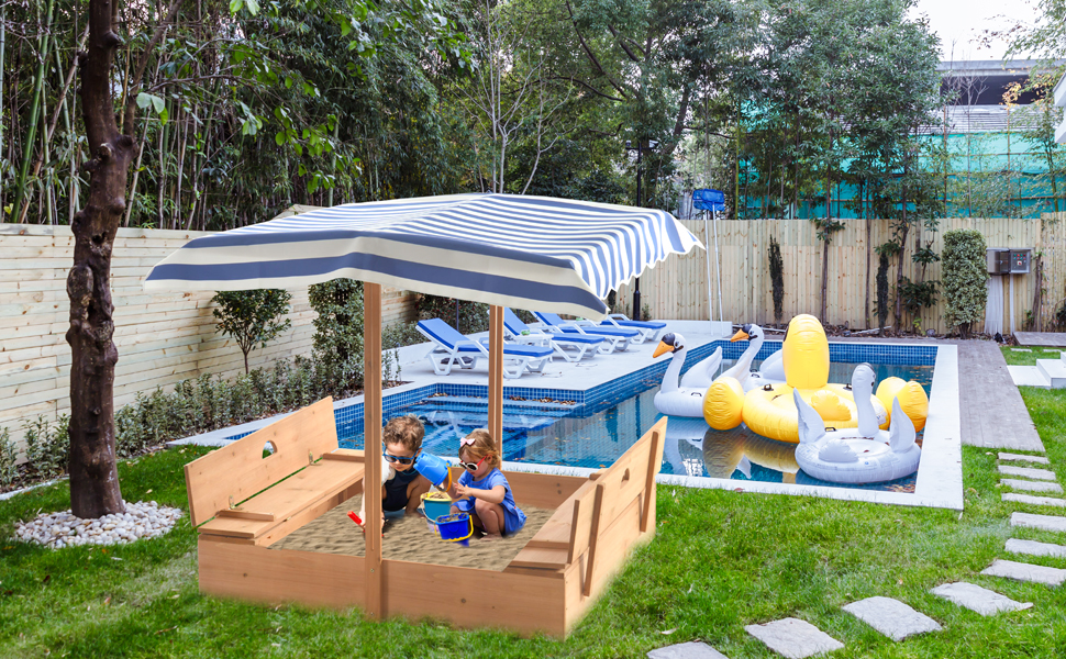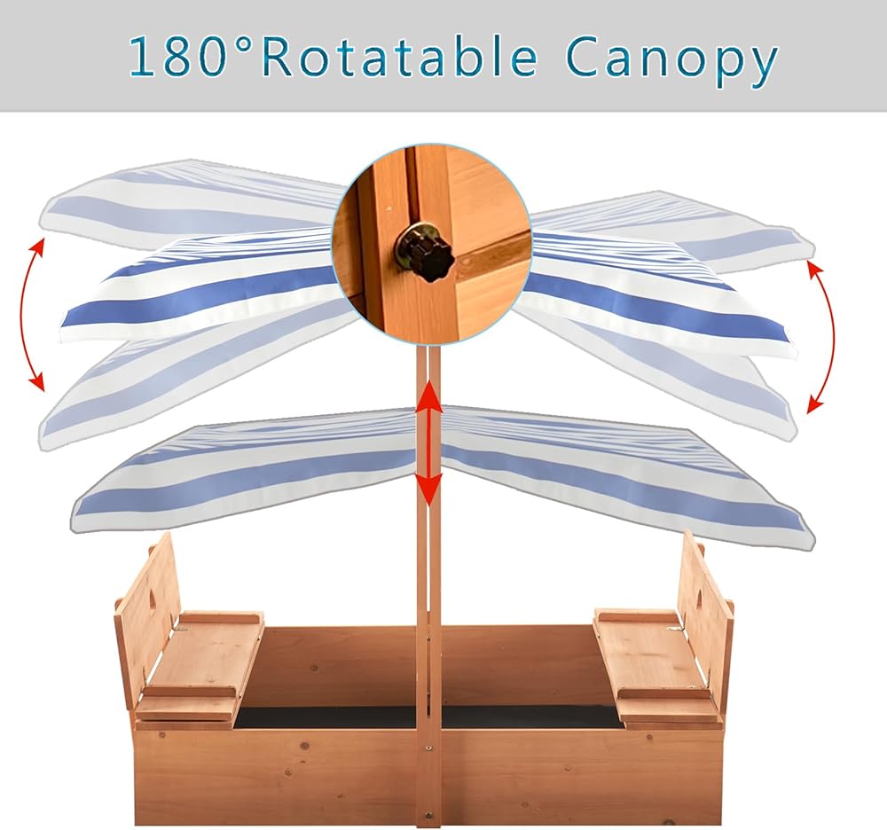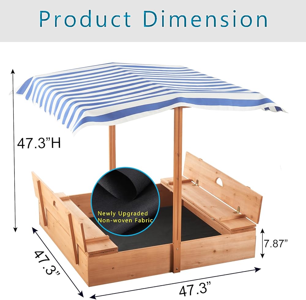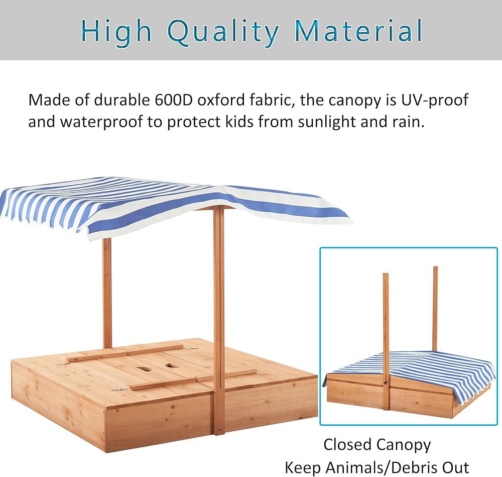 صندوق رمل مع مظلة: مصنوعة من قماش اوكسفورد 600 دي المتين، المظلة مقاومة للأشعة فوق البنفسجية ومقاومة للماء لحماية الأطفال من أشعة الشمس والمطر، ويمكن تعديلها بأي ارتفاع وزاوية. عندما لا تكون قيد الاستخدام، يمكنك ضبط المظلة على أدنى ارتفاع لتغطية وحماية الرمال من الحيوانات والحطام.