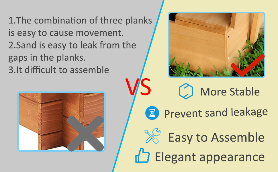 تصميم بدون قاعدة: يسهل التصريف والتهوية وتعديل عمق الرمال. يمكن لصندوق الرمل هذا حمل حوالي 400 باوند (10 قدم مكعب). الأبعاد الكلية هي 47.3 انش طول × 47.3 انش عمق × 47.3 انش ارتفاع. إضافة مثالية لافتة للنظر في الفناء والسطح والحديقة وجانب حمام السباحة والشاطئ والفناء.