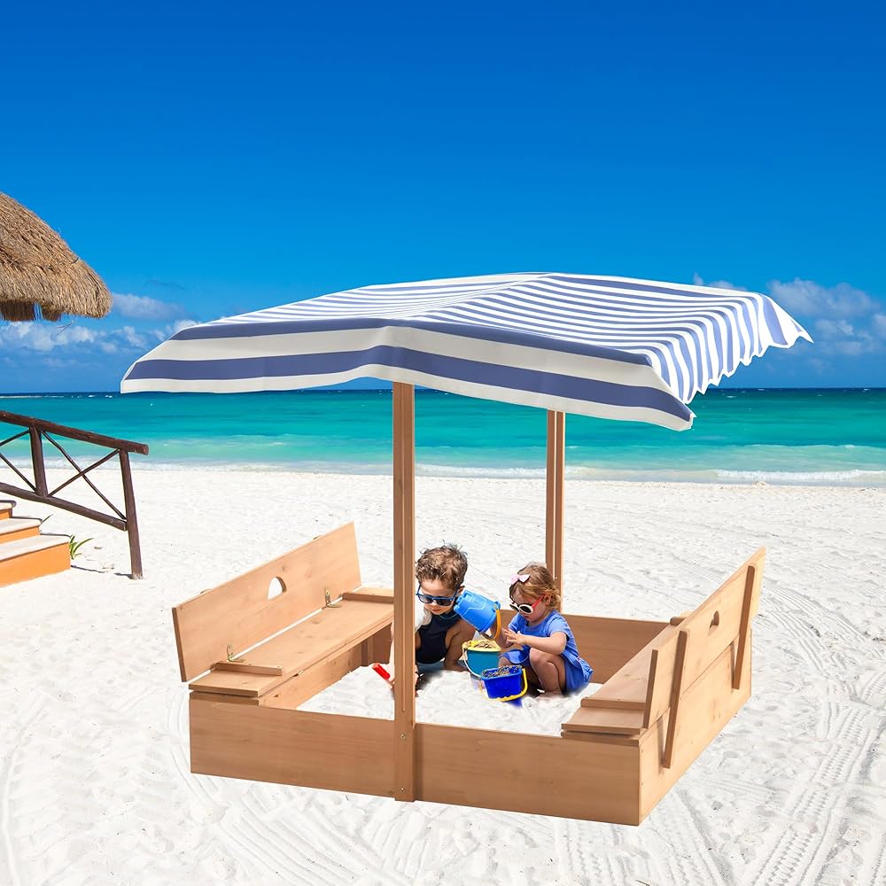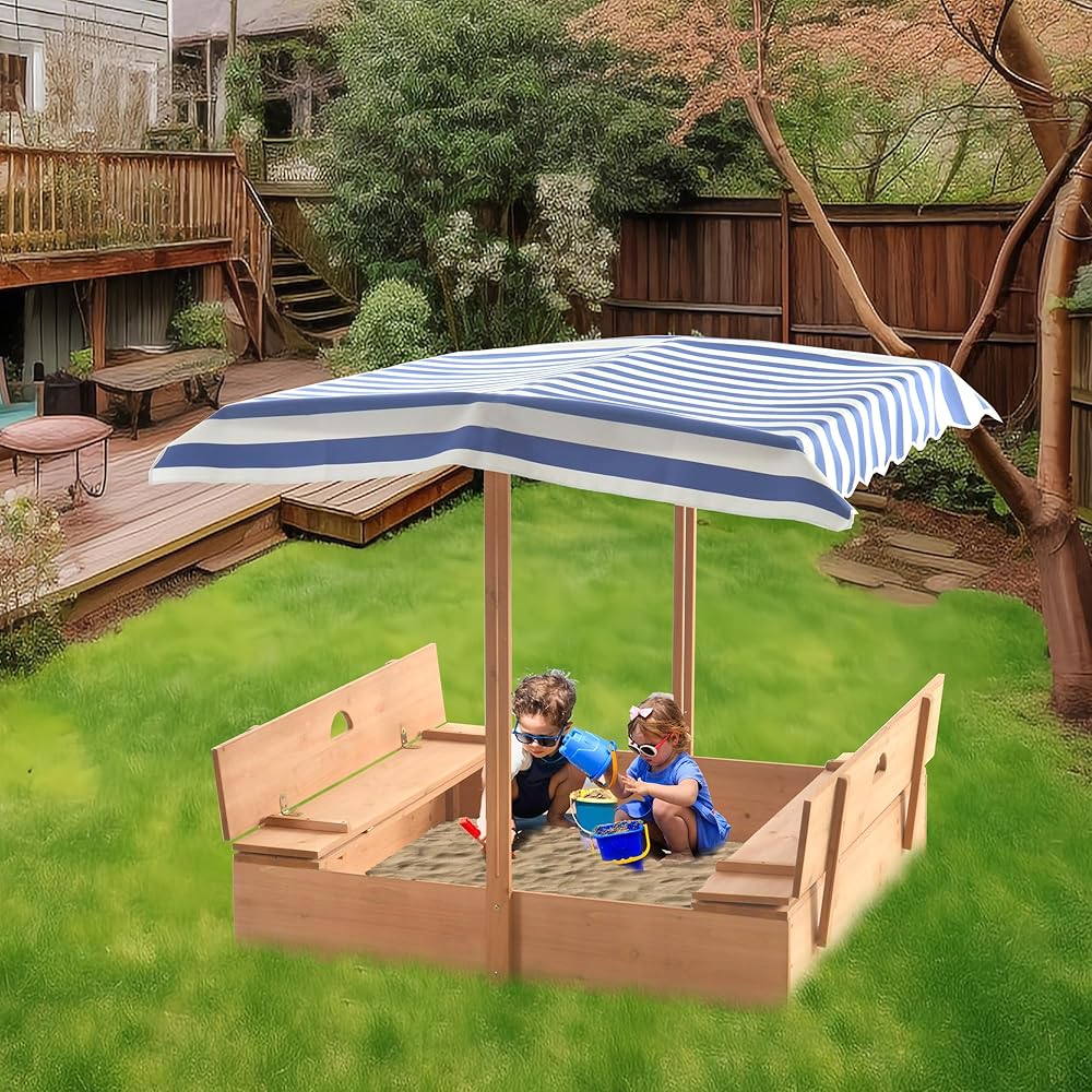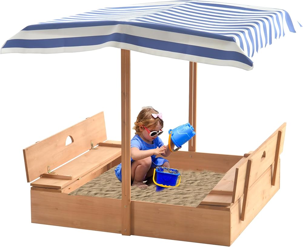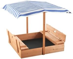 صندوق رمل خشبي مع مظلة للاطفال من عمر 3-8 سنوات من جولاسون، صندوق رمل مع غطاء سقف قابل للسحب لحديقة الفناء الخلفي، حفرة رمل مع مقعدين قابلين للطي للفناء الخارجي، ازرق