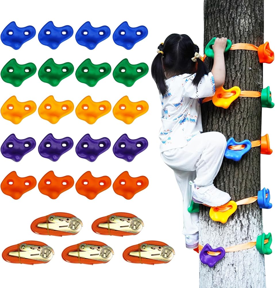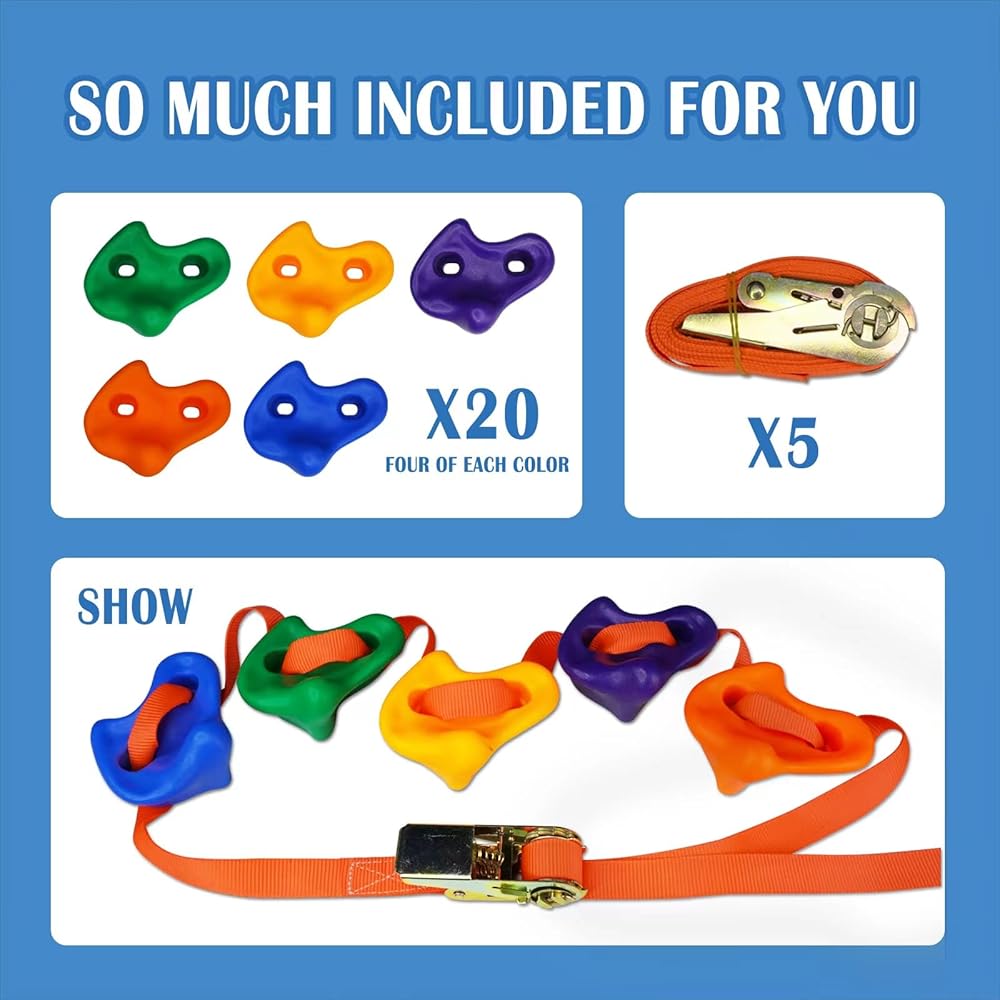 Rock Climbing Hold Kit:Our climbing hold kit includes 5 ratchet straps and 20 rock climbing holds.It is made of high quailty material that will not crack and is ideal for your outdoor use.