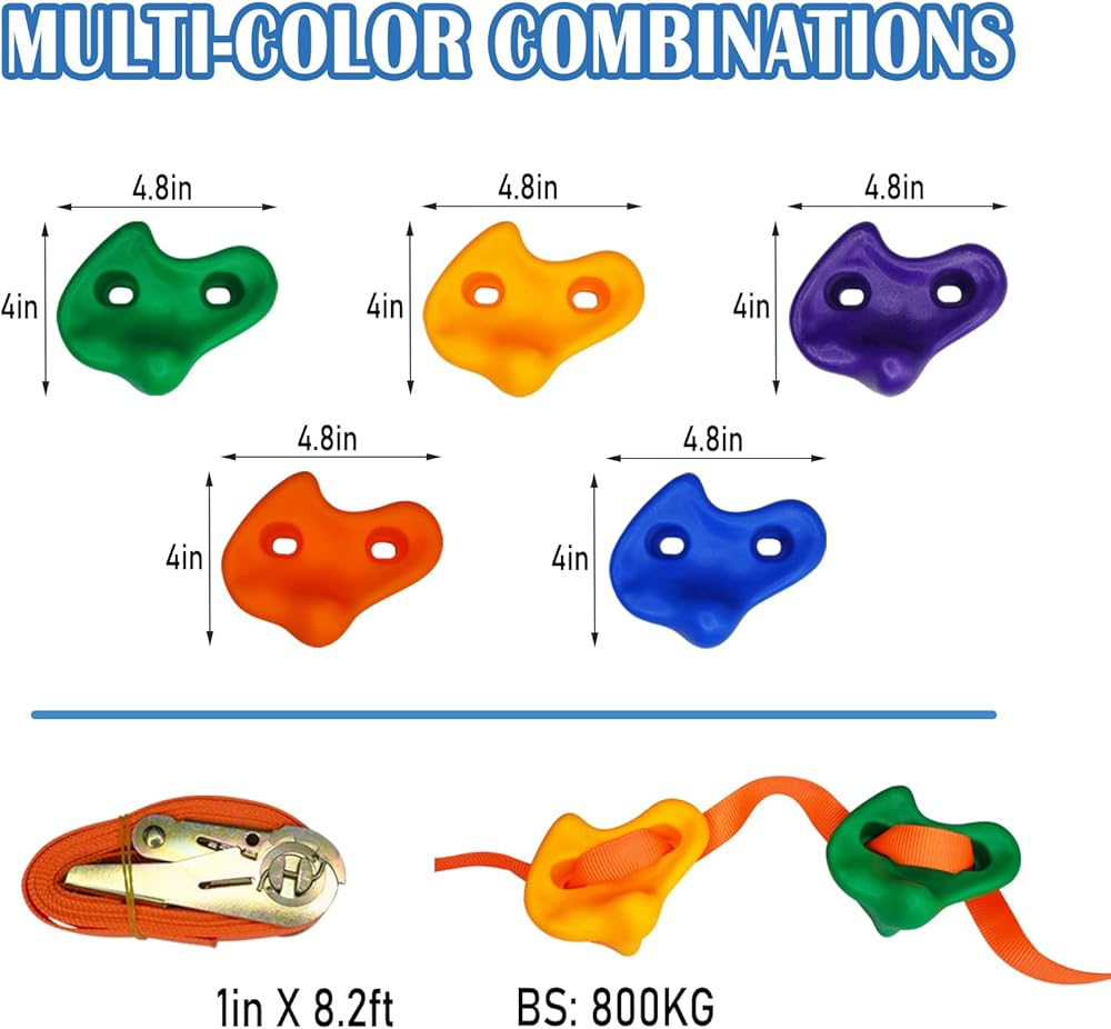 Attractive Colors:The rock climbing holds are richly colored with blue,green,yellow,purple,red.The bright colors are easy to attract children's attention and bring fun while they exercise.