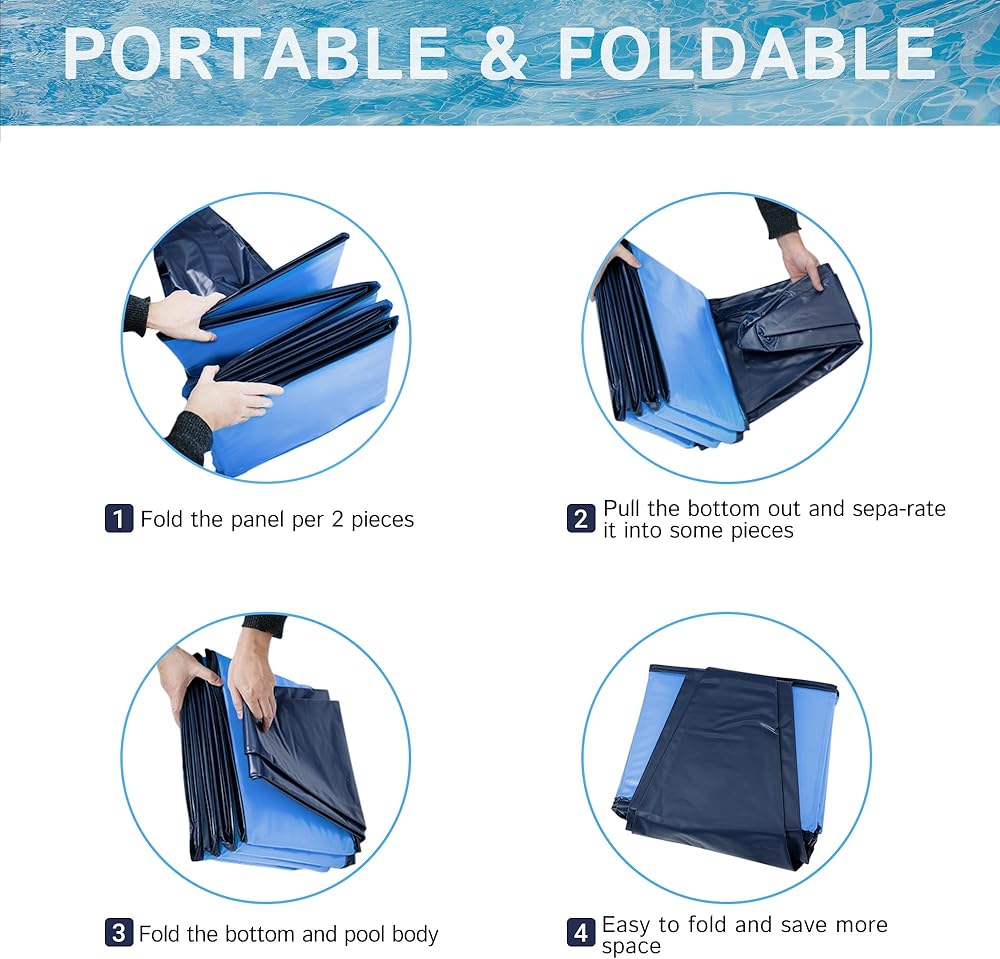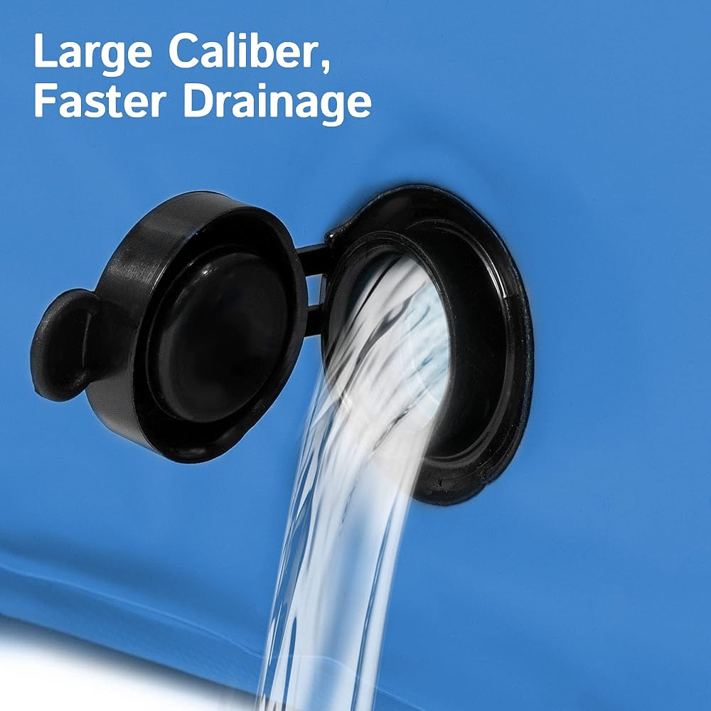 قابلة للطي والحمل: لا حاجة للنفخ وسهلة التركيب. ببساطة املأها بالماء وافتح تصريفًا مغلقًا لتفريغه في دقائق. يمكنك تنظيفها بسهولة عند انتهاء يوم واحد من اللعب. عندما لا يكون حمام السباحة قيد الاستخدام، يمكن طيه. سهلة التخزين والحمل.