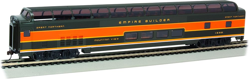 85 قبة كاملة - جريت نورثرن #1392 - منظر جبلي (الجزء الداخلي المضيء) - مقياس HO. اكتسبت سيارات الركاب من دوم شعبية في أواخر الأربعينيات عبر الولايات المتحدة. تتميز السيارة ذات القبة بقبة زجاجية أعلى السيارة حيث يمكن للركاب ركوب الدراجة والرؤية في جميع الاتجاهات حول القطار. غالبًا ما تُستخدم كسيارات للمدرب، وسيارات الاسترخاء، وسيارات المراقبة. مزايا سيارات باخمان ذات القبة : أجزاء داخلية مُضيئة ومفصلة، تفاصيل أسفل العربة، عجلات معدنية سوداء، وصلات مثبتة على الجسم E-Z Mate Mark II، محاور غير مغناطيسية، وتعمل بشكل أفضل على منحنيات نصف قطرها 22 بوصة أو أكبر."