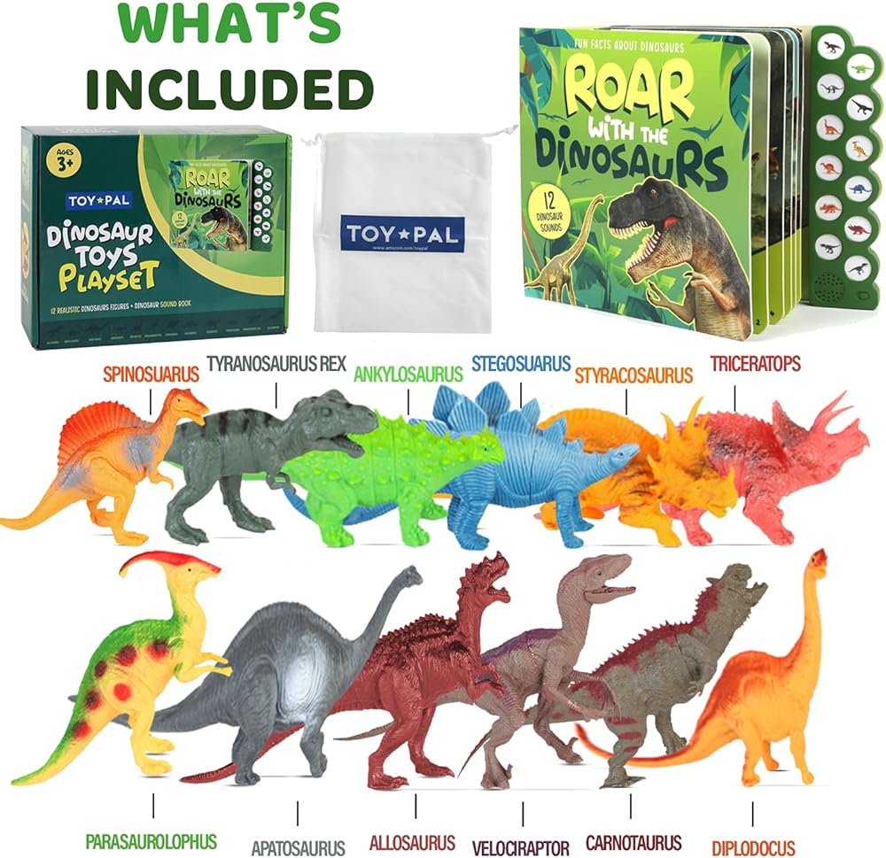 ما يتضمن - تتضمن مجموعة ألعاب الديناصورات هذه 12 شخصية ديناصور مقاس 7 بوصات لكل منها وكتاب صوت ديناصور واحد. شخصيات الديناصورات هذه متينة ومشرقة وملونة وتصمد بشكل مثالي. مثالية للأولاد والبنات من سن 2 إلى 4 سنوات فما فوق.