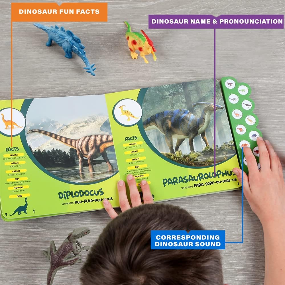 تعليمي وممتع - من تي ريكس إلى فيلوسيرابتور، سيساعد كتاب الديناصورات التفاعلي للأطفال من سن 3 إلى 5 سنوات طفلك على استكشاف عالم الديناصورات المفضلة لديه! تعرف على حجمها ونظامها الغذائي والحقائق الممتعة الأخرى من خلال الرسوم التوضيحية الملونة الكاملة والملفات الشخصية المكتوبة الملائمة للأطفال.