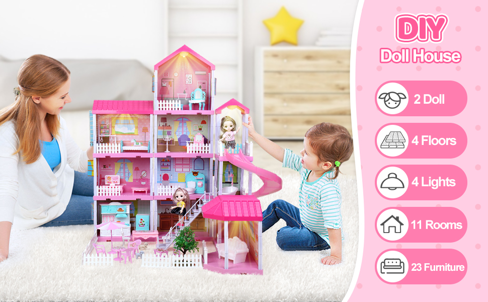 مجموعة بيت الدمى المكونة من 4 طوابق - يحتوي المنزل المصغر المكون من 4 طوابق على 11 غرفة مفتوحة، بما في ذلك الحمام وغرفة المعيشة وغرفة الأميرة وغرفة الطعام. تتضمن أيضًا زحليقة ودرجًا ودميتين لطيفتين وحيوانين أليفين. يمكن للأطفال الاستمتاع بمتعة لعب الأدوار التي لا نهاية لها في بيت الدمى. مقاس بيت الأميرة: 27.1*28.7*35.8 بوصة.
