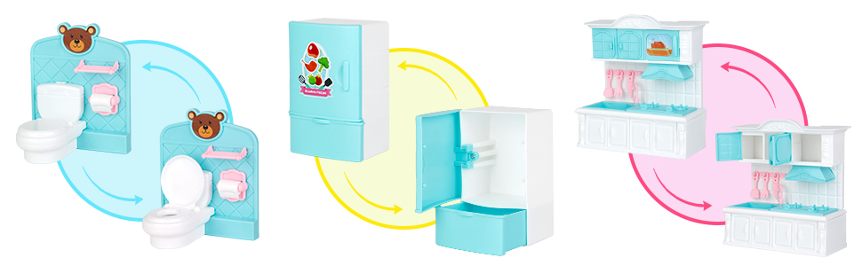 أثاث وإكسسوارات متحركة - يحتوي المنزل الريفي على أكثر من 70 قطعة أثاث وإكسسوارات واقعية، بما في ذلك مرحاض قابل للطي وثلاجة وخزائن قابلة للفتح. حتى تتمكن الفتيات الصغيرات من نقل الأثاث أو إضافته لتزيين منزلهن حسب الرغبة. يمكن للأطفال ارتداء الملابس مع الأصدقاء ولعب الأدوار مع الحيوانات الأليفة. يوفر بيت الألعاب هذا الكثير من إمكانيات رواية القصص، ويمكن للفتيات إنشاء قصة رائعة خاصة بهن.