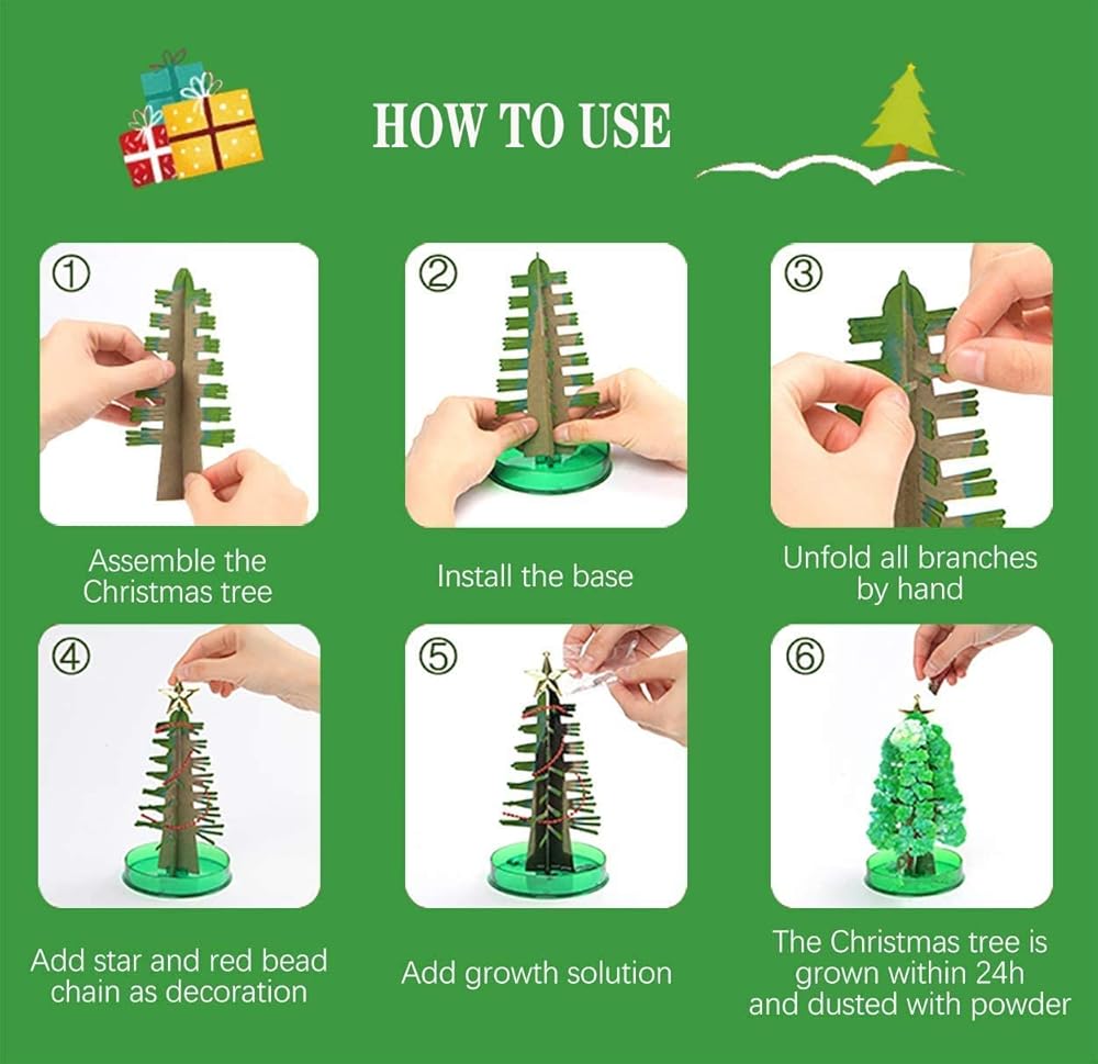 سهل الاستخدام: أضف السائل السحري الخاص إلى قاعدة شجرة الورق المقوى وشاهد البلورة تنمو. تنبت الشجرة أوراق الشجر الخضراء على أغصانها. خط جديد مبتكر لعيد الميلاد يجذب جميع الأعمار، ويساعد على خلق جو احتفالي.
