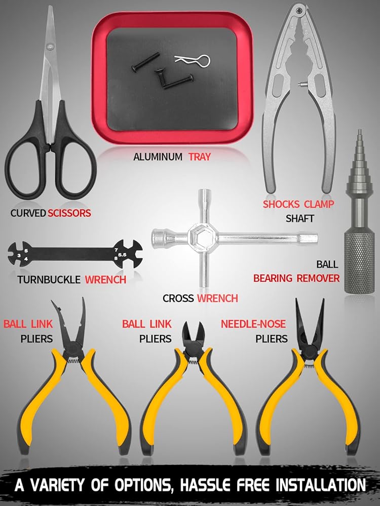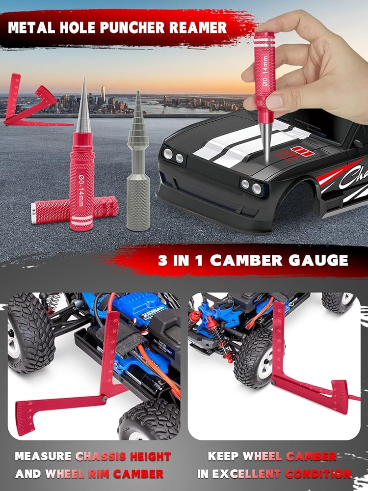 【أداء رائع】يقيس مقياس الحدبة 3 في 1 ارتفاع سيارة RC وإطار حافة العجلة. صينية مغناطيسية تحافظ على جميع أجزائك في مكانها وفي متناول اليد. يساعدك Reamer على توفير الوقت والجهد عند التثقيب. يمكن استخدام الكماشات (الأنف الإبرة/القطرية/الوصلة الكروية) للإمساك بالأسلاك الفولاذية وقطعها وثنيها. أنواع مختلفة من الأدوات لتلبية متطلباتك المختلفة!