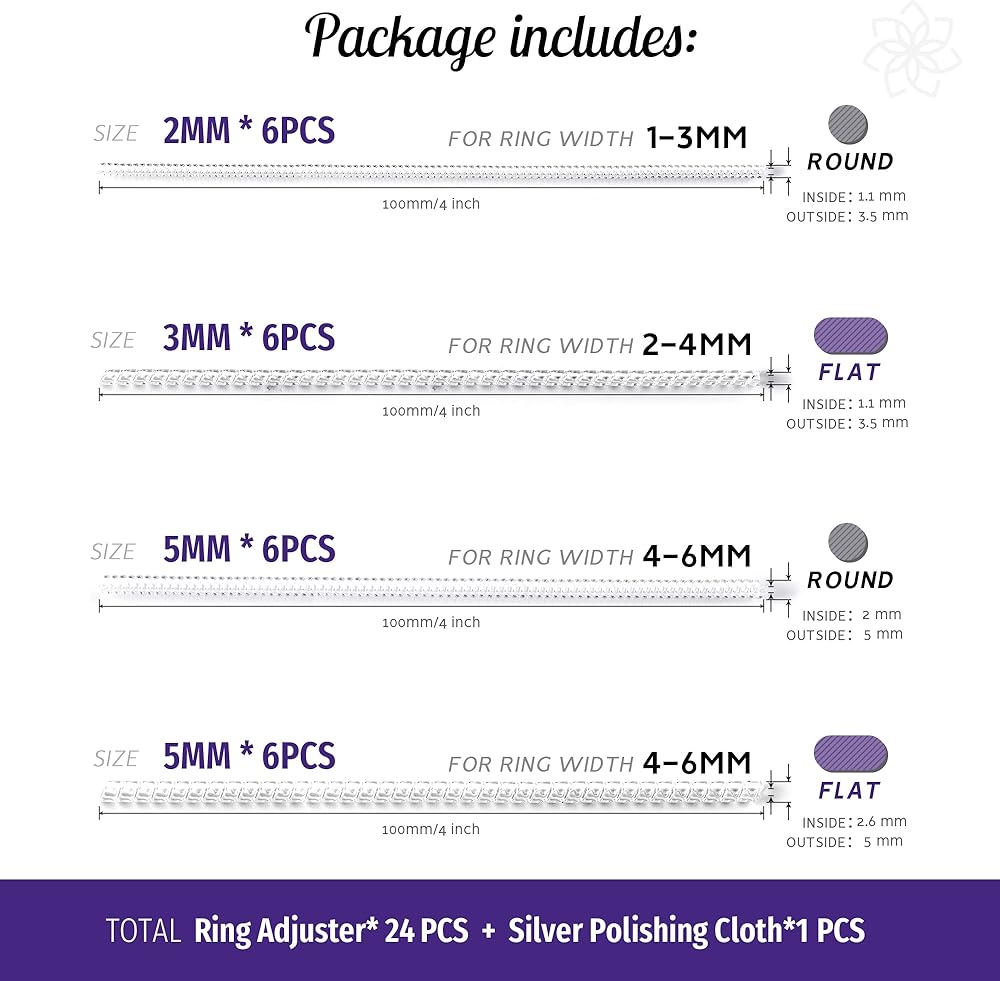 ⭐1 حزمة لإصلاح جميع مشاكل حجم الخاتم - عبوة واحدة تتضمن - 24 واقي حلقة للحلقات الفضفاضة، وقطعة قماش تلميع فضية، والتعليمات. 4 مقاسات حسب اختيارك: 2 مم دائري، 5 مم دائري، 3 مم مسطح، 5 مم مسطح، نمطان (دائري ومسطح)، سمك مختلف، كل قطعة بطول 10 سم، كل مقاس يأتي في 6 قطع بإجمالي 24 حزمة معًا، مقاس الخاتم هذا أداة ضبط الضبط مناسبة لمعظم مقاسات الخاتم. تلبي احتياجاتك المختلفة.