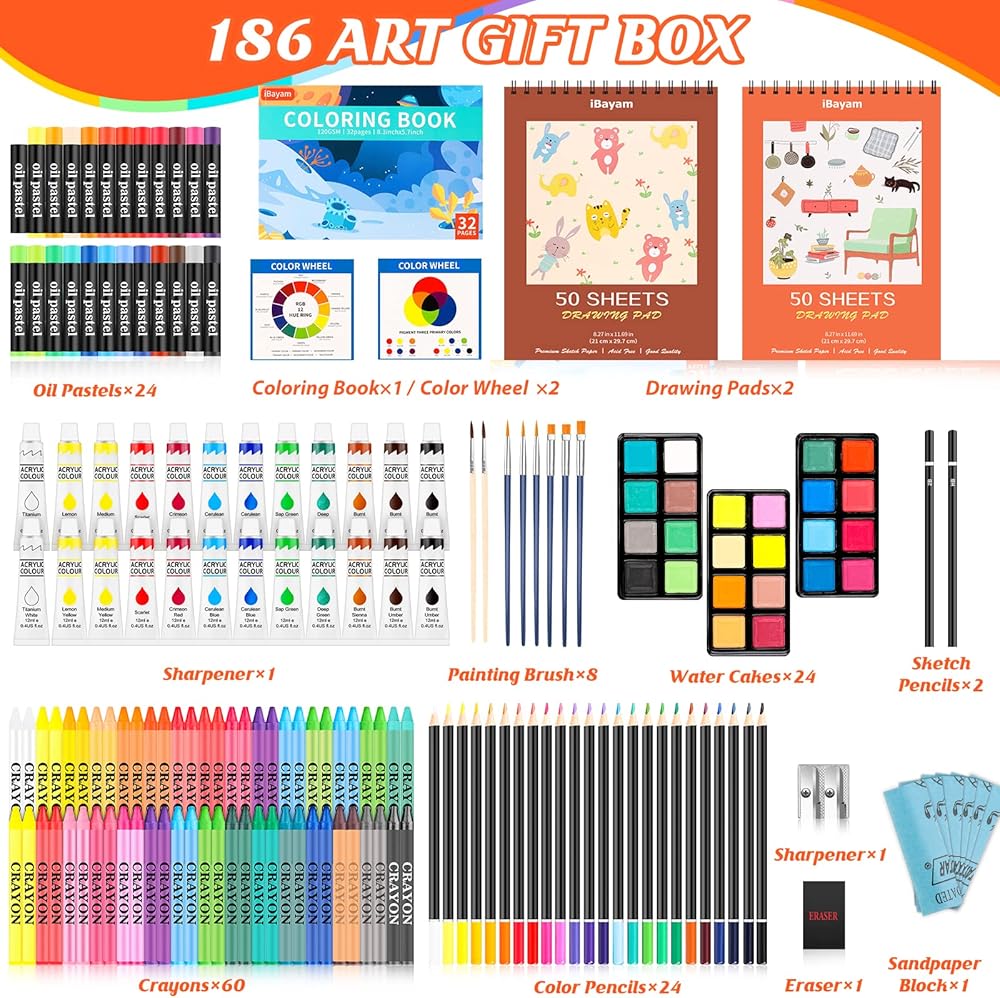 لوازم فنية، مجموعة فنية فاخرة مكونة من 186 قطعة مع لوحتي رسم مقاس A4، وكتاب تلوين واحد، و24 طلاء أكريليك، وأقلام تلوين، وأقلام رصاص ملونة، وصندوق هدايا إبداعي للبالغين من الفنانين المبتدئين والأطفال والبنات والأولاد