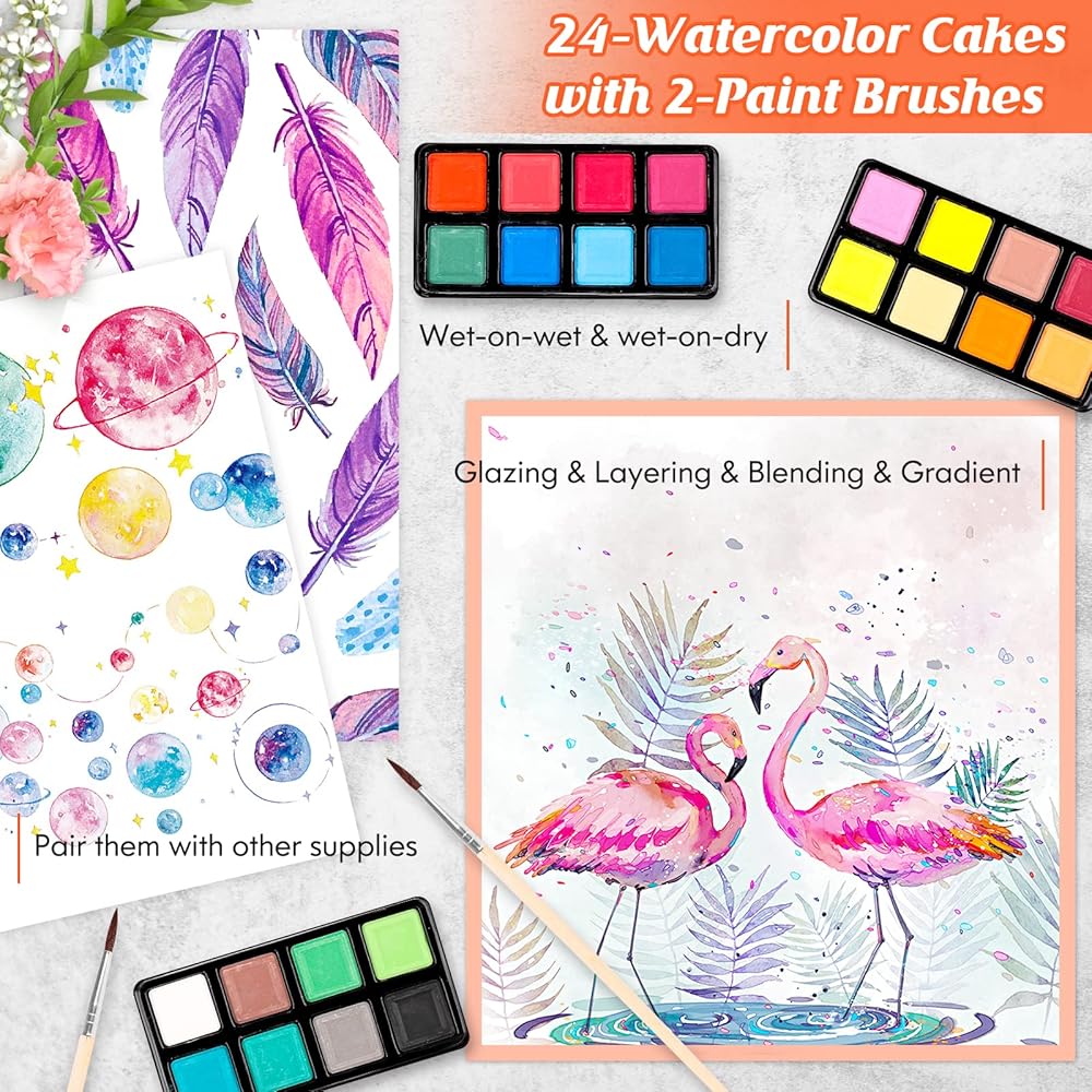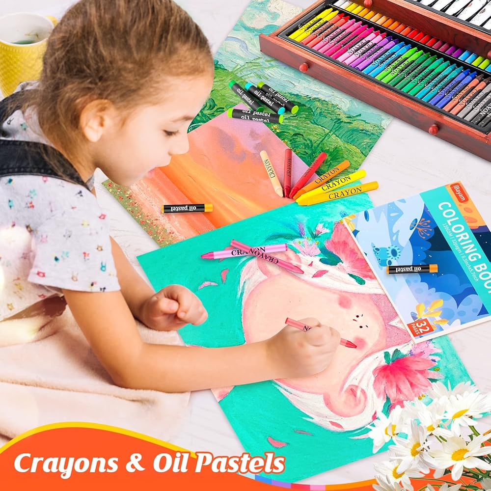 🎨【مجموعة لوازم فنية كاملة مكونة من 188 قطعة في علبة فاخرة】: تتضمن مجموعة الرسم الممتازة هذه 60 قلم تلوين، و24 طلاء أكريليك (12 لونًا مائيًا و12 طلاء أكريليك)، و24 قلم رصاص ملون، و24 قلم باستيل زيتي، و24 كعكة بألوان مائية. ، 3 × 8 لوحات رسم، 2 لوحة رسم، 1 كتاب تلوين، 2 أقلام رسم، 8 فرش رسم، 10 قوالب ورق صنفرة، 2 عجلات ملونة، 1 مبراة، 1- مسطرة، 1- ممحاة، 1- حالة الفن الخشبي.