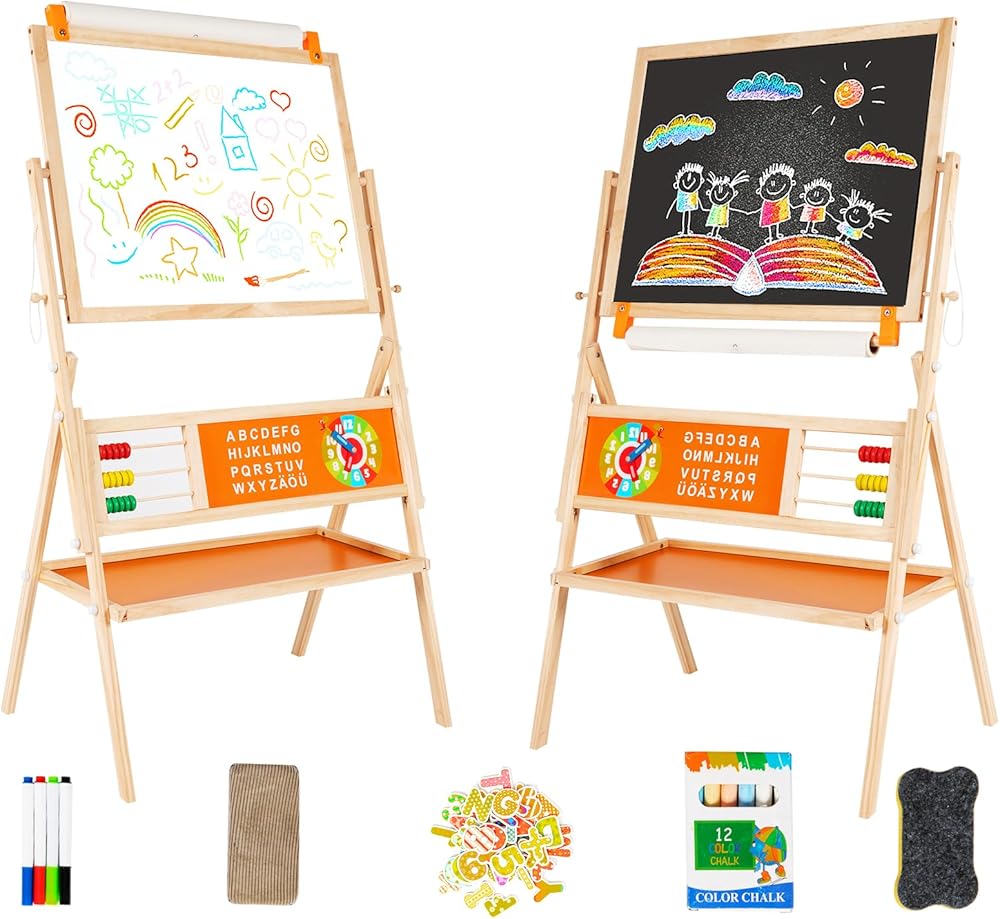 حامل خشبي 3 في 1 من OMOTIYA للأطفال، حامل للأطفال على الوجهين مع سبورة بيضاء مغناطيسية وسبورة طلاء سوداء، قابل للدوران 360 درجة، حامل لفائف الورق، صينية تخزين، وملصقات متضمنة