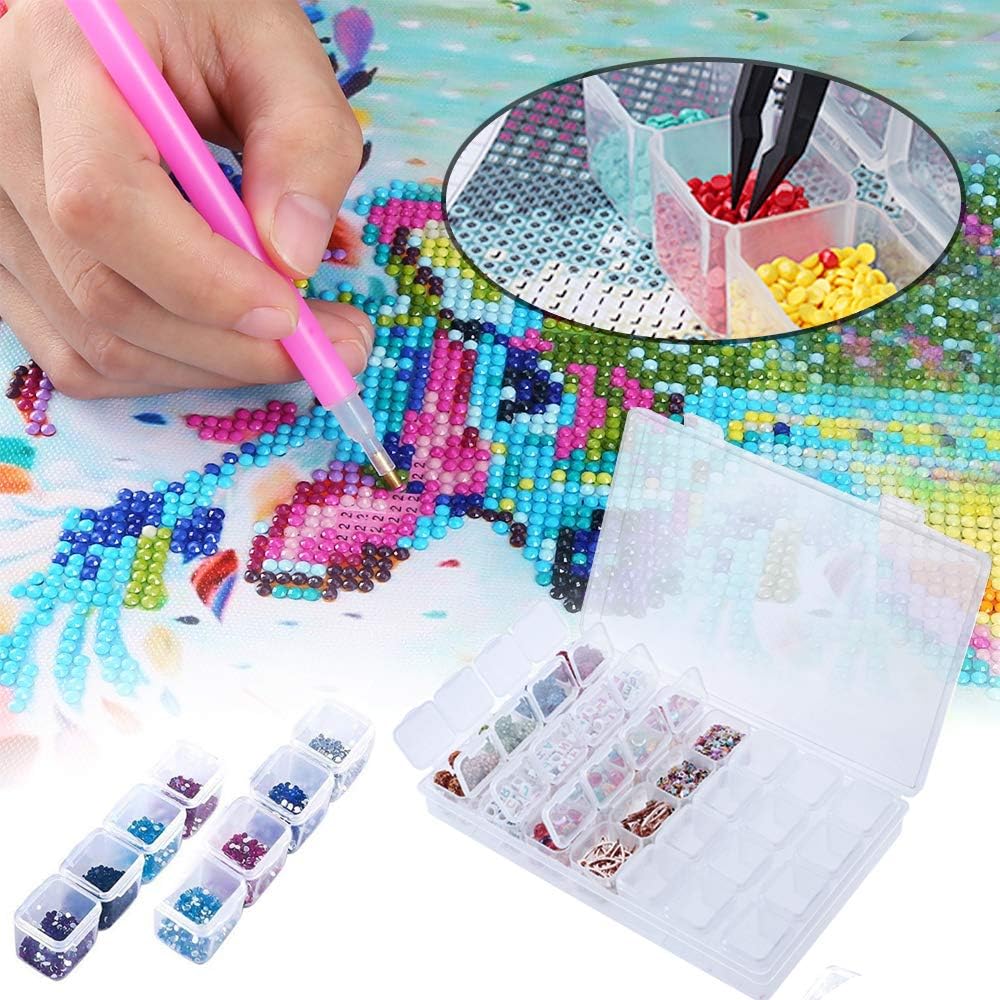 • صندوق تخزين مطرز بالألماس الصلب: تخزين بلاستيكي شفاف قوي وغير سام للوحات الماسية، يسهل الوصول إليه للحصول على اللون الدقيق لثقوب الرسم الفني الماسي بسرعة