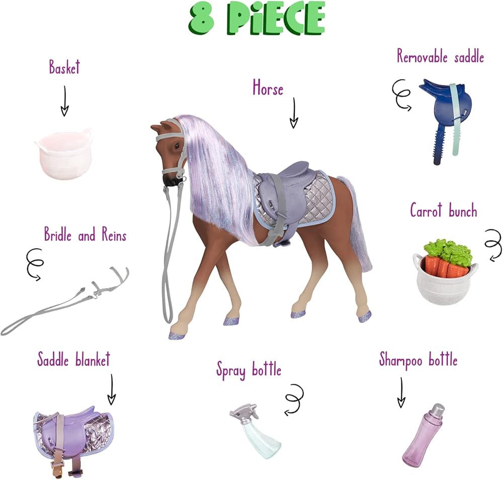 يشتمل على: (1) حصان (1) سرج (1) بطانية سرج (1) لجام نجمي وزمام (1) تاج (1) مشط. الدمى المصورة هي سارينيا وكيلتي. (تباع الدمى بشكل منفصل). الدمى الموصى بها للأطفال من سن 3 سنوات فما فوق