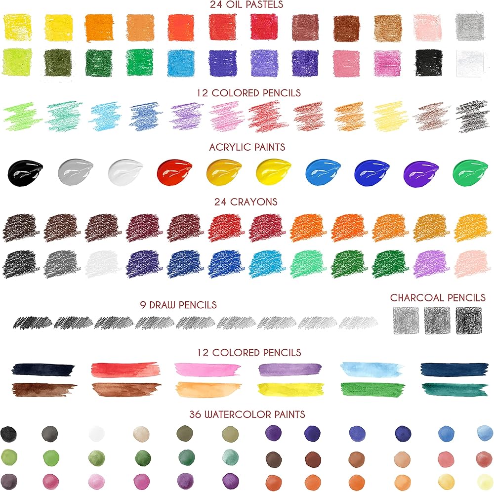 • حقيبة محمولة: ستساعدك مجموعات الفنانين الكاملة التي تحتوي على 150 ملحقًا وأداة على تحقيق إبداعات لا حصر لها. إذا كنت تفضل الألوان المائية: علبة خشبية واحدة و12 قلم رصاص بألوان مائية و36 لونًا بألوان مائية. أو أكريليك: 10 ألوان أكريليك و10 فرش. أو، إذا كنت تفضل الرسم: 24 قلم تلوين، و24 قلم باستيل زيتي، و12 قلم رصاص ملون، وممحاة معجون واحدة، وأقلام الرصاص، وأقلام الفحم، ولوحة الألوان، ودليل و4 دعامات مختلفة تتكيف مع كل وسيط.