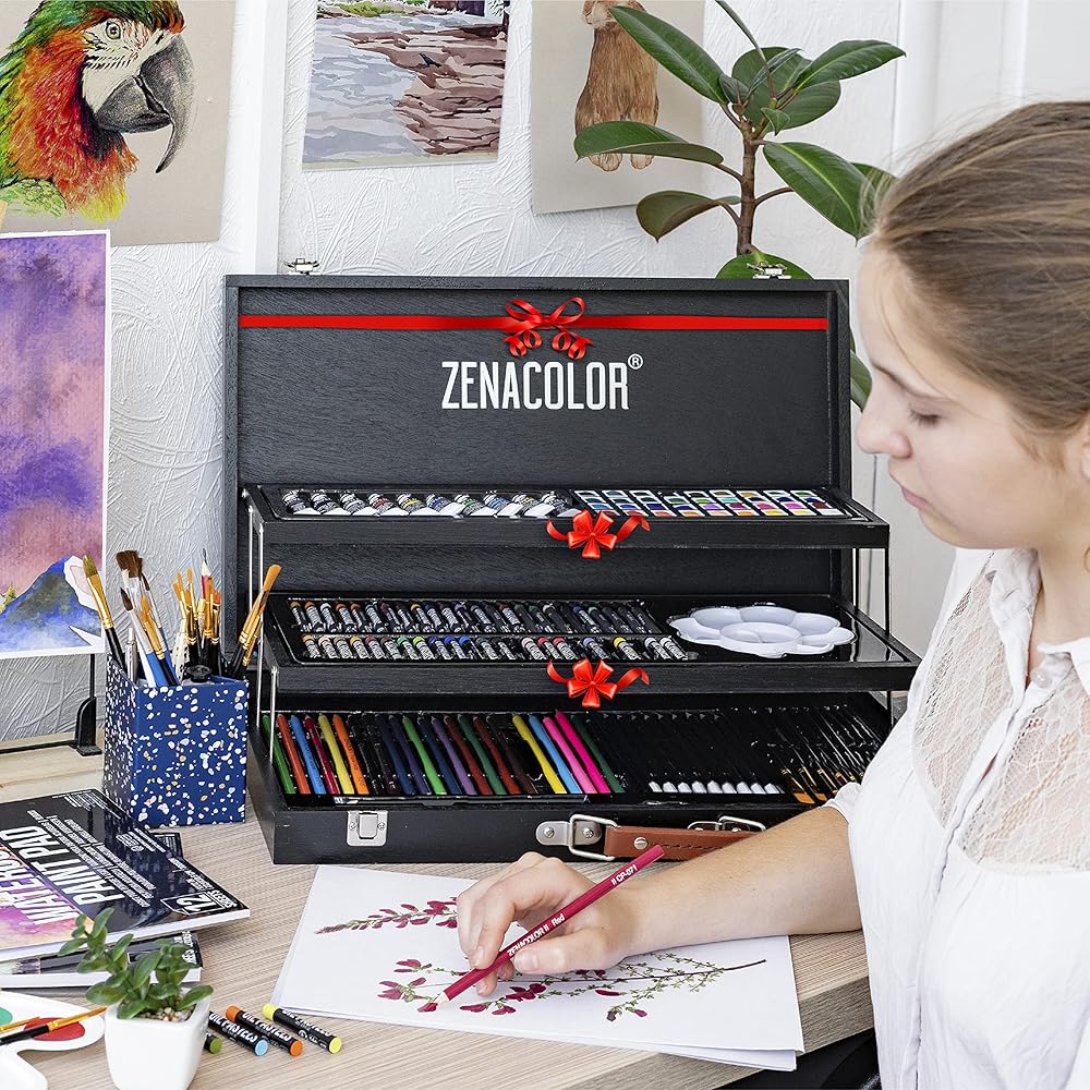 مجموعة فنون الوسائط المختلطة من Zenacolor مقاس XXL مع علبة خشبية احترافية (150 قطعة) - لوازم فنية للرسم والرسم والتلوين - الباستيل والأكريليك والألوان المائية وأقلام التلوين وأقلام الرصاص - 4 لوحات رسم