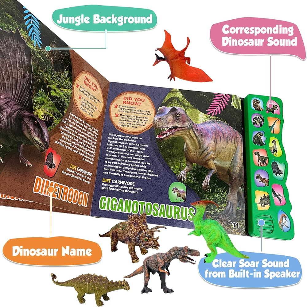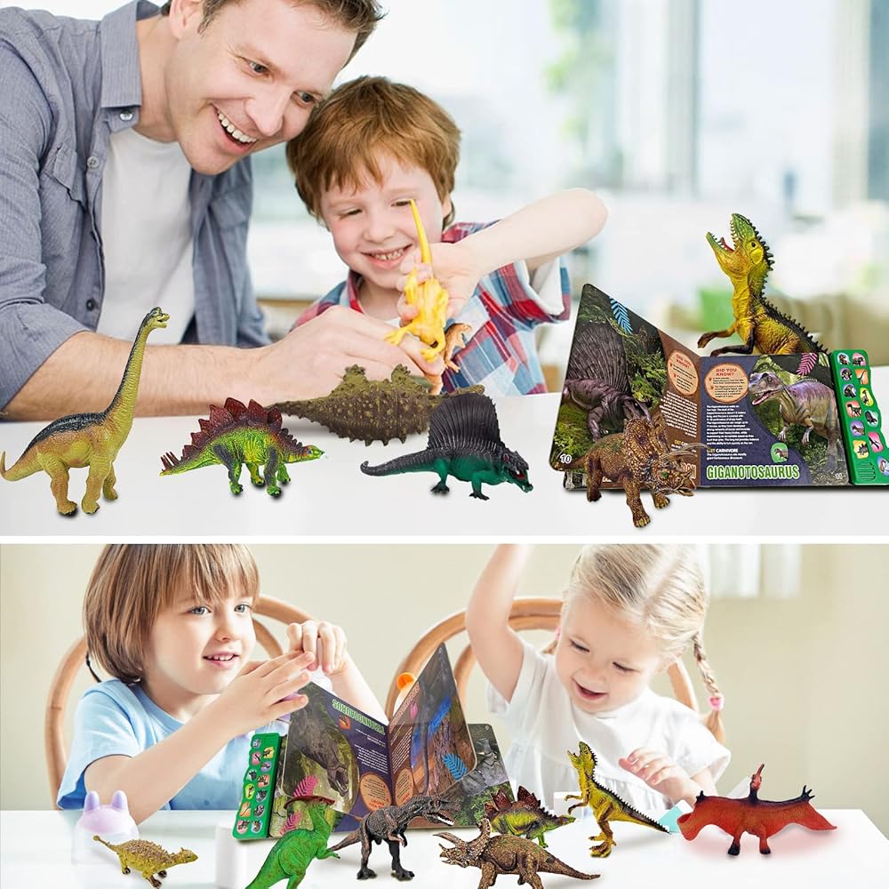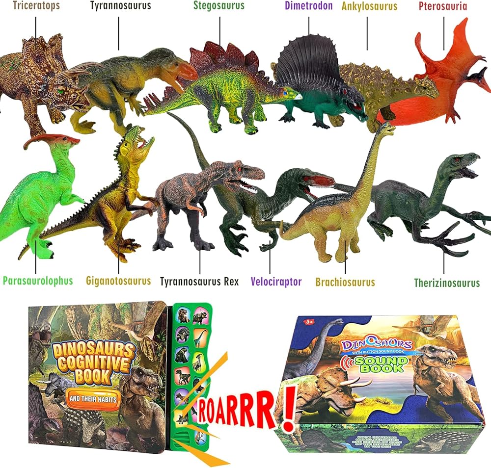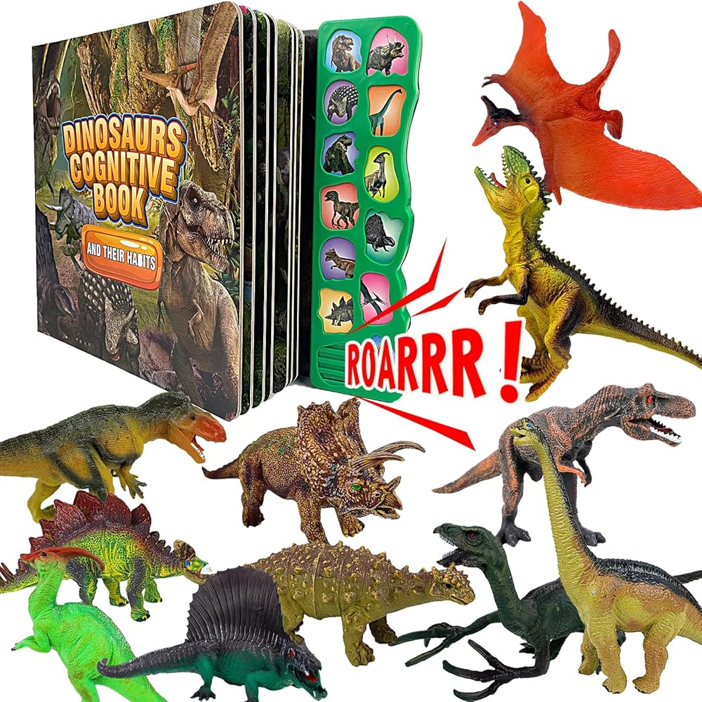 ألعاب ديناصور لعمر 3 سنوات فما فوق - كتاب صوت ديناصور و12 شخصية ديناصورات ذات مظهر واقعي، بما في ذلك تي-ريكس، والتريسيراتوبس، واليوتاهرابتور، للأطفال والأولاد والبنات.