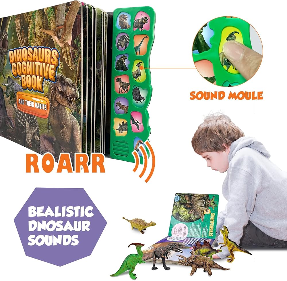 ألعاب ديناصور مضحكة: جرب عصر الديناصورات مع الفضول! اكتشف أصوات من ألعاب الديناصورات، شاهد الديناصورات مرة واحدة على الديناصورات. انغمر بالكامل مع مجموعة الديناصورات هذه مع كتاب صوتي بينما تستمع إلى أصوات الديناصورات. كل زر في الكتاب له صورة لنوع واحد من الديناصورات. اضغط عليه لسماع هدير ديناصور واحد. كن حذرًا، قد تكون الديناصورات في وسطك!