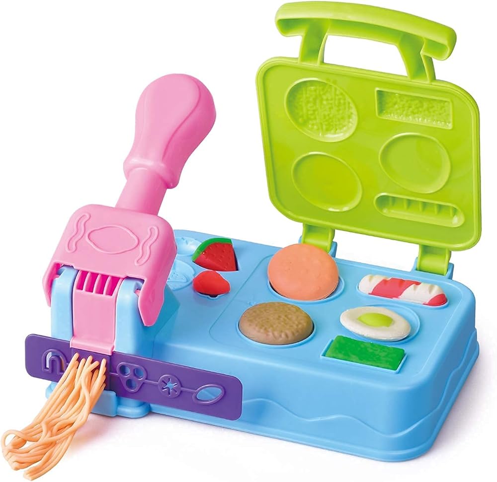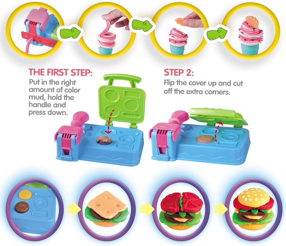 استمتع بالمرح! إبداعات وقت الغداء التظاهري ترقى إلى الخيال مع هذه المجموعة من الأدوات. داخل الشواية، يمكن للطهاة المبدعين تخيل الهامبرغر والآيس كريم والهوت دوج والنودلز والكعك والإضافات الخاصة بهم، ثم تشكيلها باستخدام مركب عجين اللعب! اصنع حلقات بصل رائعة والمزيد من طبقات اللعب على غطاء الشواية. عندما تكون روائع النزهة جاهزة، شاركها واعرضها مع الأطباق!