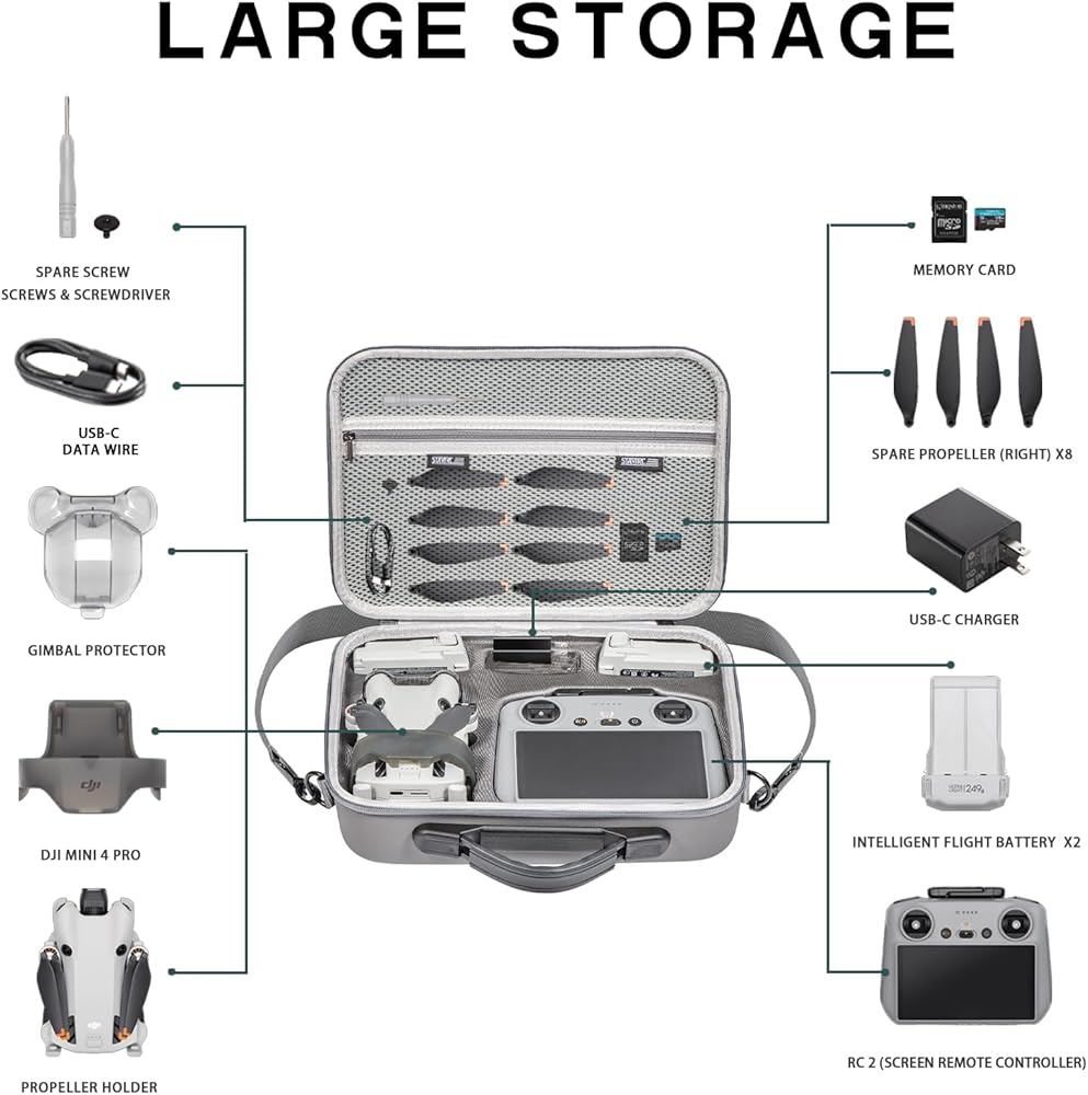 【Custom Fit】 This carrying case is designed specifically for the DJI Mini 4 Pro Fly More RC 2 Combo and other related accessories. It securely stores your drone with gimbal protector and propeller holder, and DJI RC 2 sereen remote controller while providing additional 2 slots for flight battery, 1 for charger.