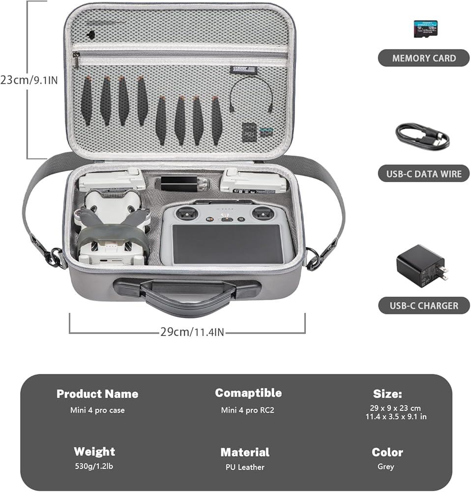【Package Includes】 This listing includes one carrying case for the DJI Mini 4 Pro Fly More RC 2 Combo with an adjustable shoulder strap. The case measures 29×23×9 cm (11.4×9×3.5 inches) and weighs 0.53 kg (1.2 pounds). The shoulder strap length adjusts from 80-145 cm (31-57 inches). Please note that the case is sold separately and does not include the DJI Mini 4 Pro Fly More RC 2 Combo or any other accessories mentioned.