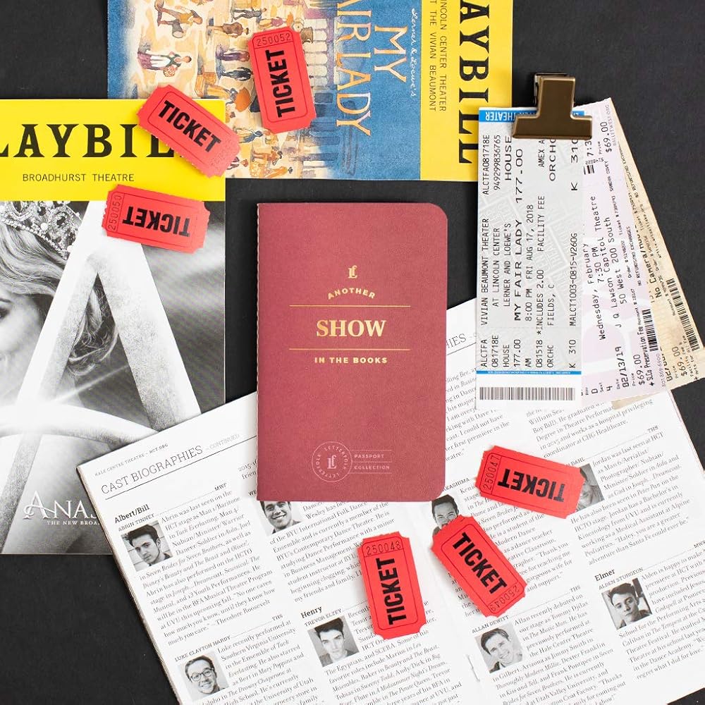 تجارب التجميع: The Show Passport عبارة عن مجلة بحجم الجيب مكونة من 48 صفحة تتضمن 20 صفحة دخول لتسجيل تفاصيل ذات معنى من كل عرض يتم حضوره، بالإضافة إلى 8 صفحات إضافية تتضمن قوائم مرجعية وقوائم دلو وأنشطة ومعلومات ممتعة أخرى. تكون كل صفحة إدخال مصحوبة بصفحة فارغة للملاحظات أو الذكريات أو التذكارات المثبتة مثل الصور أو الإيصالات.