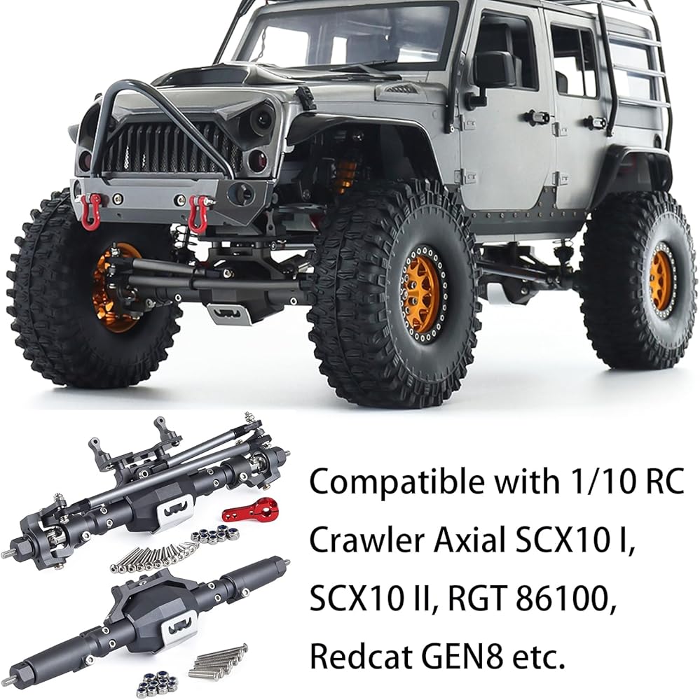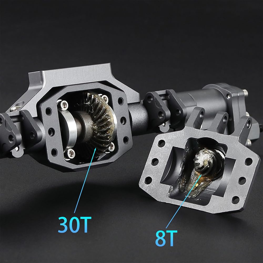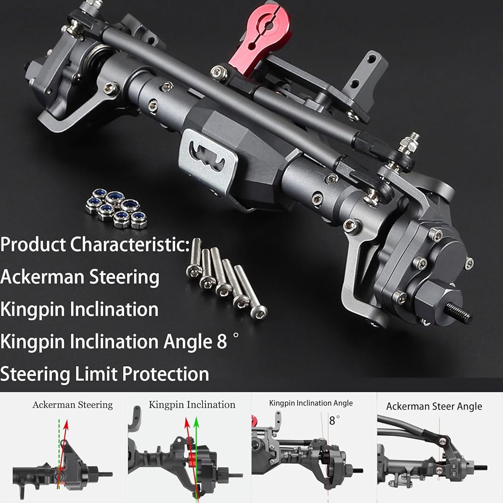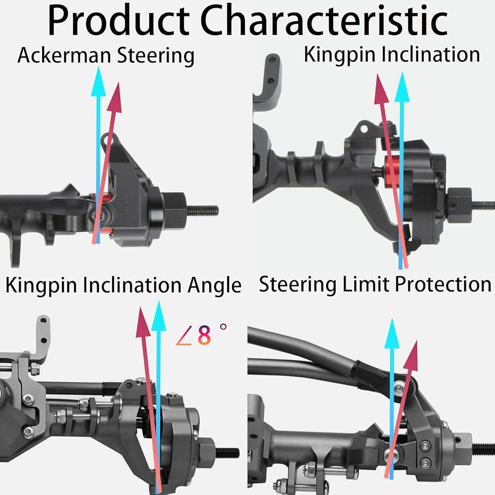 🚔🚔【Powerful Performance】The scx10 pro axles has a steering capacity of up to 45 degrees, which provide higher ground clearance and reduce the torque on other drivetrain components for improved the flexibility and stability of off-road driving.