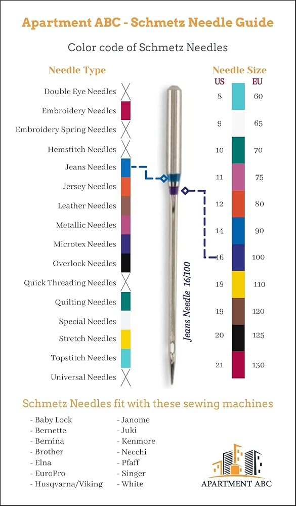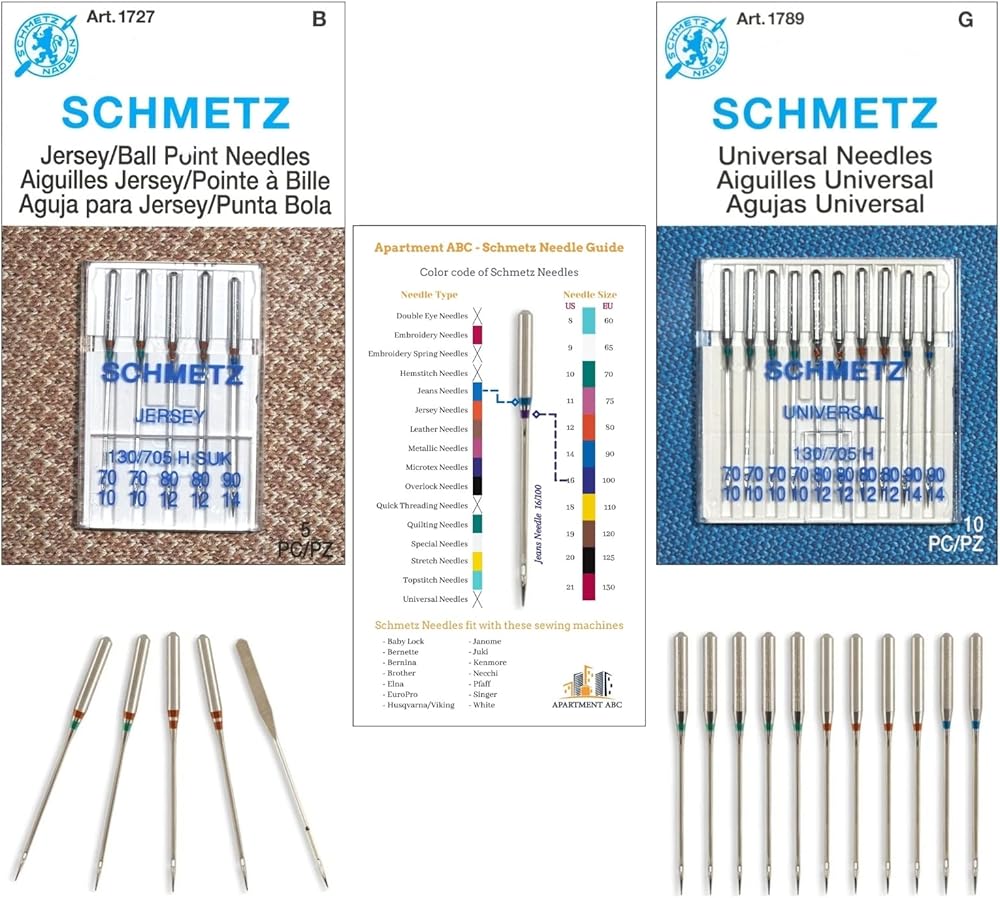 تستخدم إبر ماكينة الخياطة العالمية من شميتز نظام اتش 130/705، وهو متوافق مع معظم آلات الخياطة المنزلية، بما في ذلك برذر وبيبي لوك وبيرنيت وبرنينا وإلنا، ويورو وهاسكفارنا وفايكينغ وجانوم وجوكي وكينمور ونيو هوم وبفاف وسينغر وأبيض.