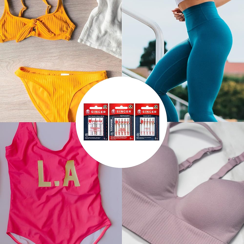 Set of 11 assorted stretch and ball point sewing machine needles in bulk ideal for sewing standard stitches across a variety of sewing projects on stretchy and knit fabrics like lycra, spandex, jersey knits, tricot knits, and more