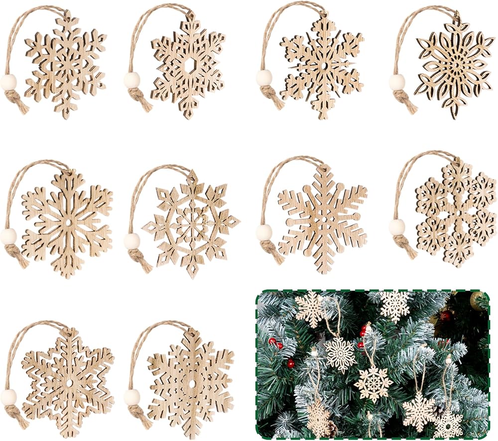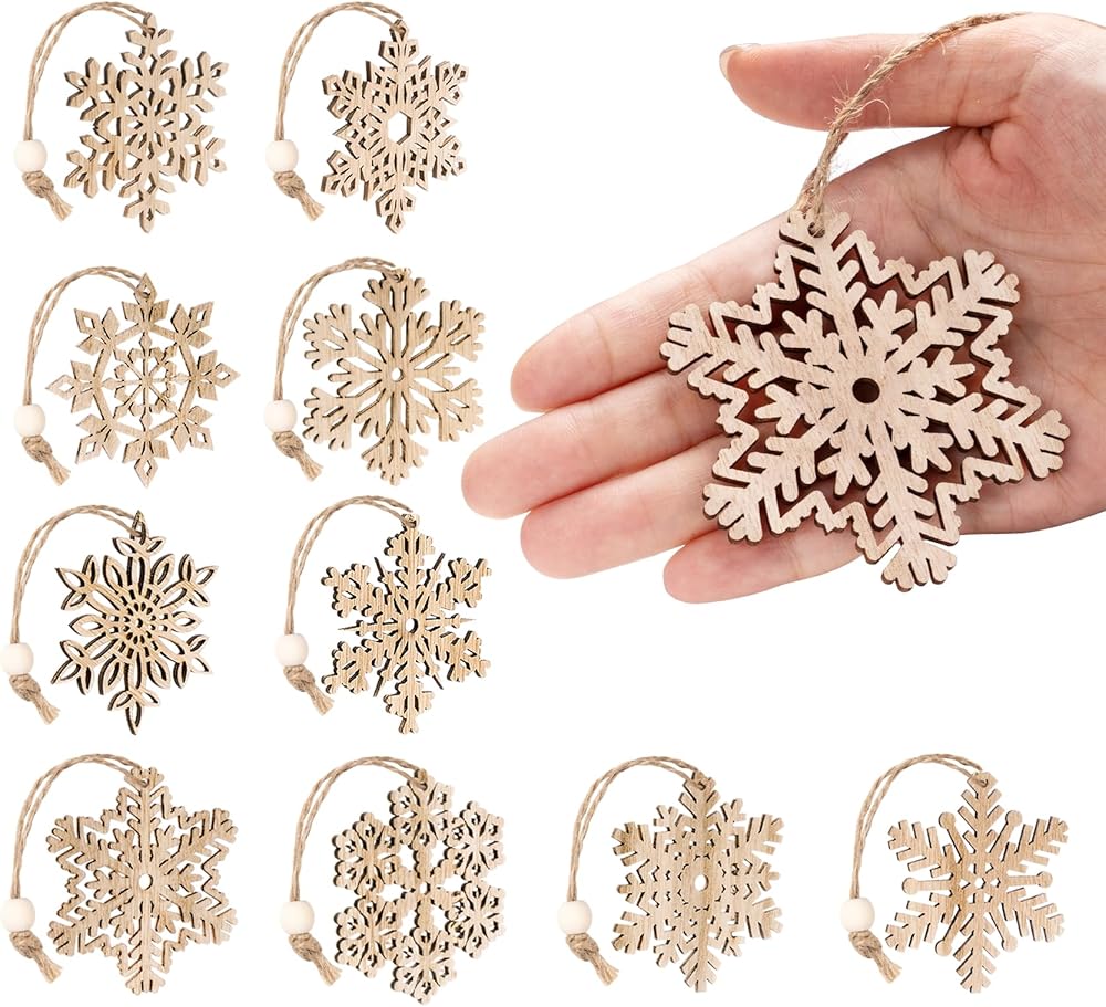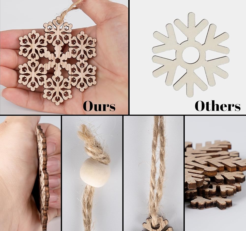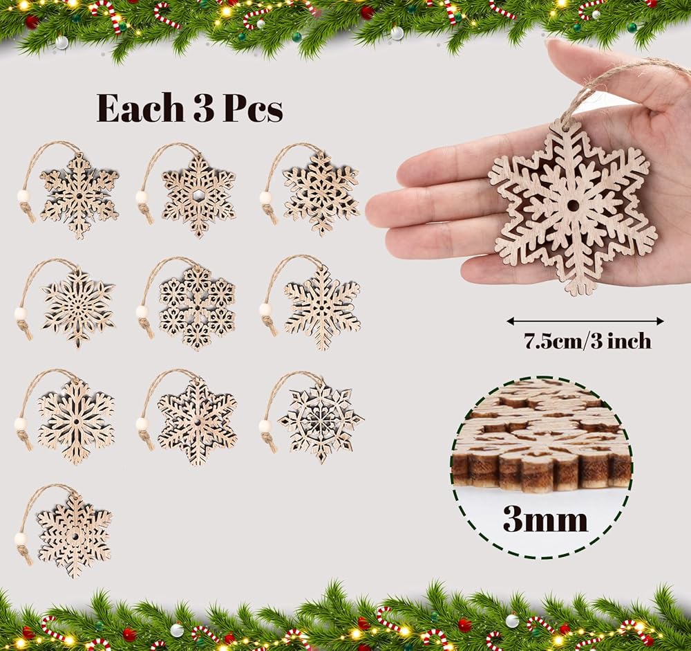 زخرفة رقاقات الثلج الخشبية غير المكتملة من ABSOFINE، 36 قطعة من زينة شجرة الكريسماس المعلقة لتزيين الخشب بنفسك على شكل ندفة الثلج وحرف عيد الميلاد مع خيوط (9)