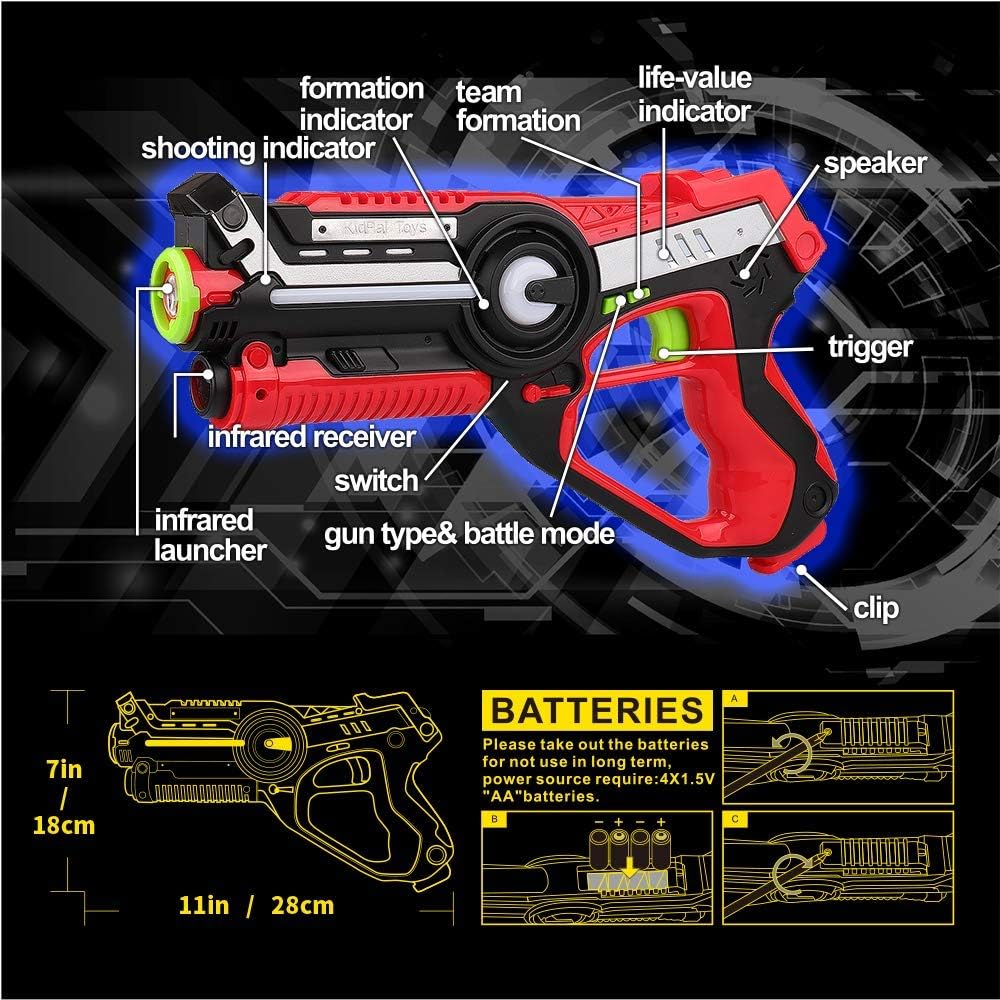 🔫آمنة بنسبة 100% مع تقنية بطاقة الليزر بالأشعة تحت الحمراء - مجموعات بطاقات الليزر هذه مع مسدس معتمدة وآمنة للأولاد. سلامة الأطفال هي أولويتنا الأولى، فنحن نستخدم إشارة الأشعة تحت الحمراء أقل من 1 ميجاوات (0.9 ميجاواط). لا تنبعث منها أشعة ليزر حقيقية. علامة الليزر للأولاد من سن 8 إلى 12 سنة هي نشاط رياضي بدني، ولكن علامة الليزر للأطفال لا تستخدم مقذوفات جسدية وبالتالي فهي غير مؤلمة. لا داعي للقلق بشأن تعرض الأطفال للأذى أثناء لعبة بطاقة الليزر.