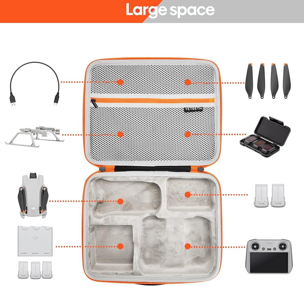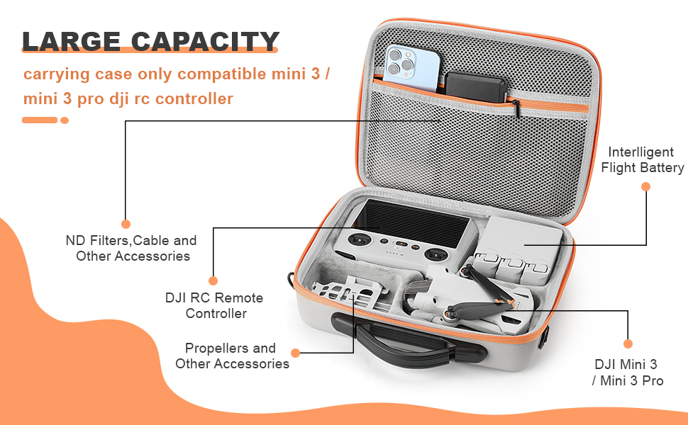 Large Capacity The Mini 3/Mini 3 Pro Storage Bag can hold a drone, 1x remote controller, 6x batteries, 1x Charging Hub, cables, propellers, SD cards and many other drone accessories.