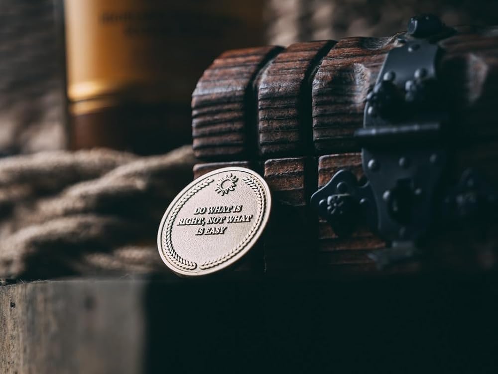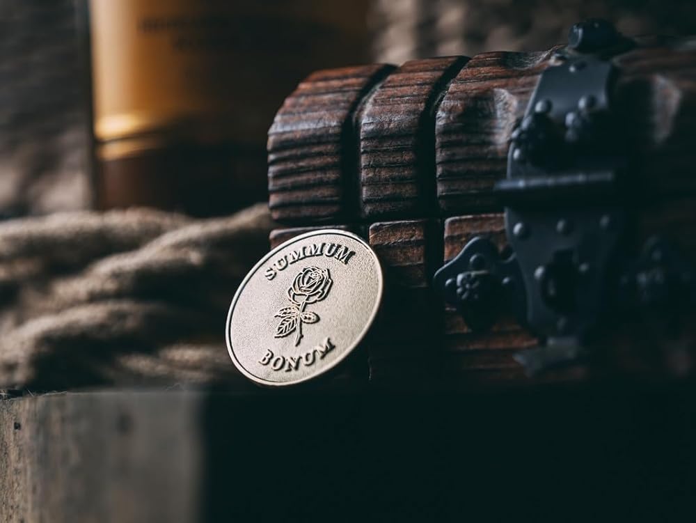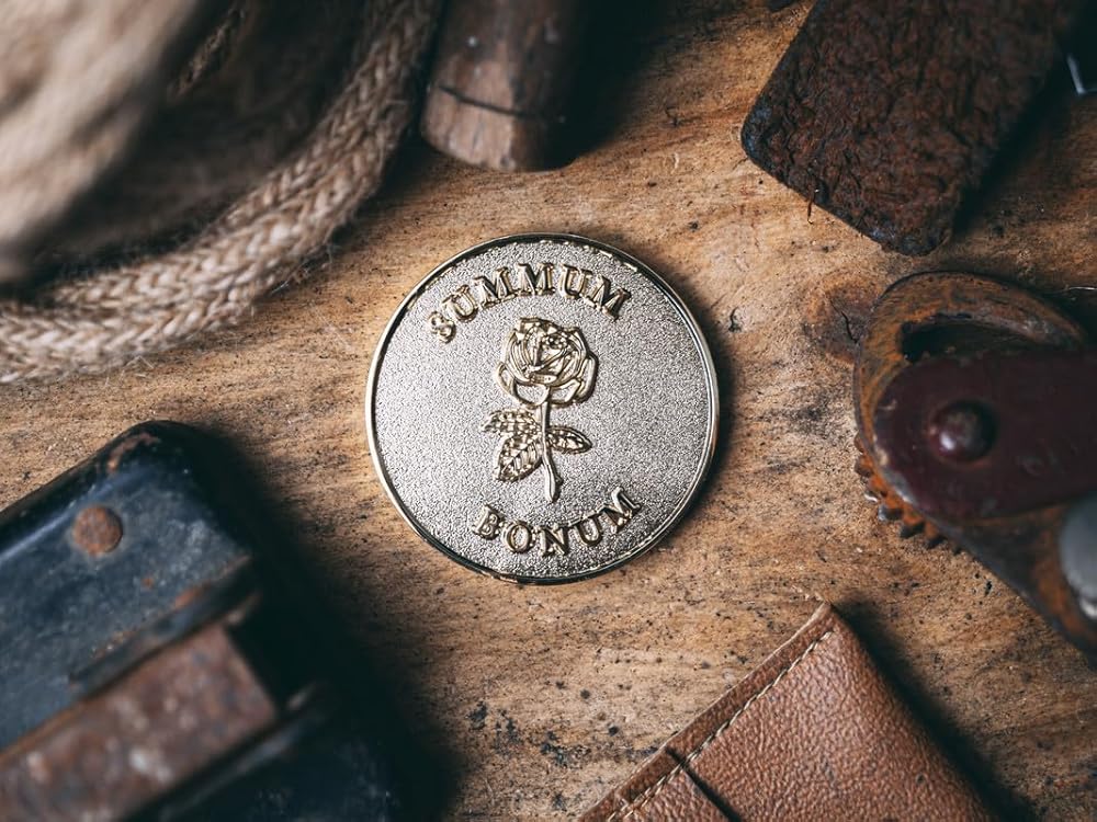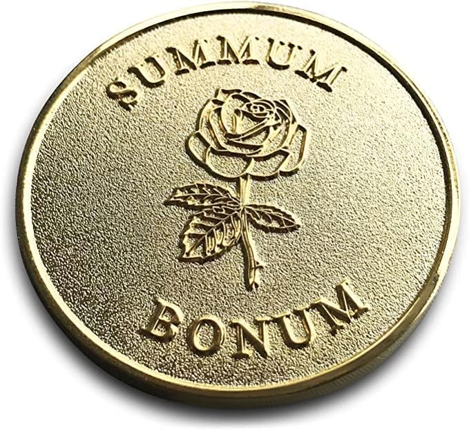 تم تصميم عملة ساموم بونوم هذه لتذكيرك بأن لديك دائمًا خيار التصويب للحصول على "أعلى جودة" في أي شيء تفعله. يجب أن تهدف دائمًا إلى التصرف والقيام بما هو صحيح، وليس ما هو سهل بالضرورة. من الضروري في ممارسة الرواقية والحياة اليومية أن تكون دائمًا على استعداد لفعل الشيء الصحيح، حتى وخاصة عندما يكون غير مريح. يتميز الجزء الأمامي من العملة بتصميم بسيط يعرض الرسالة الأساسية لـ "Sumum Bonum" - أعلى جودة. ترتبط صورة الوردة ارتباطًا وثيقًا بمفهوم سوموم بونوم، وعلى الأخص من قطعة روبرت فلود من عام 1629. تمثل أشواك الساق والأوراق الحادة تحديات التصرف وفقًا لـ "جيد". تمثل الوردة المزهرة ثمار العمل وفقًا لـ "ساموم بونوم". يتميز الجزء الخلفي من العملة باقتباس "افعل ما هو صحيح، وليس ما هو سهل." تعكس الرسالة الموجودة على الجزء الخلفي من العملة الرمزية في المقدمة. على الرغم من أن ما هو صحيح وما هو سهل يتزامن في بعض الأحيان، إلا أن هذا نادرًا ما يكون الحال. الشمس الساطعة هي تمثيل آخر لـ "أعلى جودة". العملة المعدنية مصنوعة من النحاس وتتميز بلمسة نهائية ذهبية رملية. يبلغ قطر كل عملة 38 ملم. جميع العملات المعدنية مزدوجة الجوانب ولها حواف مسطحة.