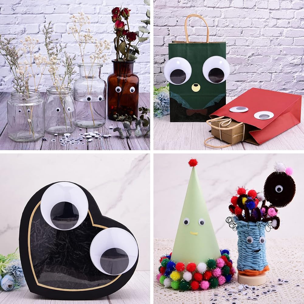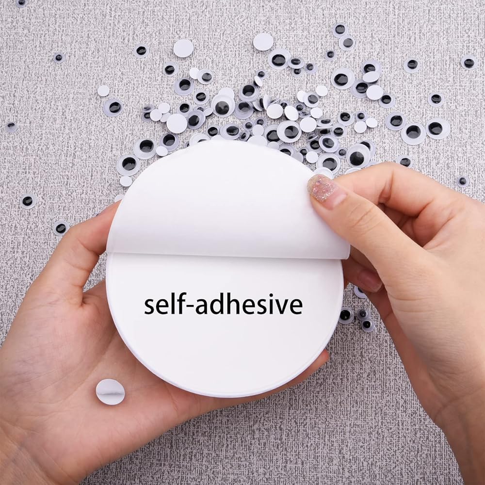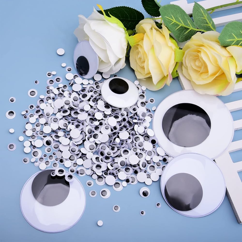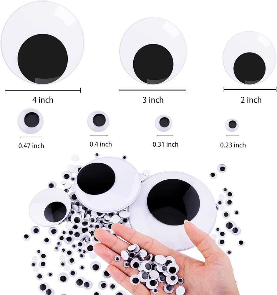 • Include: 1000 pieces small wiggle eyes and 8 pieces giant wiggle eyes, 2 pcs 4 inch eyes, 2 pcs 3 inch eyes, 4 pcs 2 inch eyes, 0.23 inch about 500 pcs, 0.31 inch about 300 pcs, 0.4 inch about 100 pcs, 0.47 inch about 100 pcs