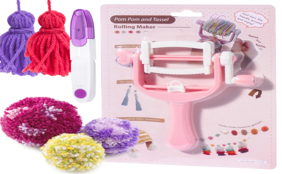• صانع بوم بوم: سوف تحصل على صانع بوم بوم يمكنه صنع أحجام مختلفة وقطعة مقص على شكل حرف U مع غطاء لإضافة كرات بوم بوم إلى الملابس والقبعات والحقائب المفضلة لديك.