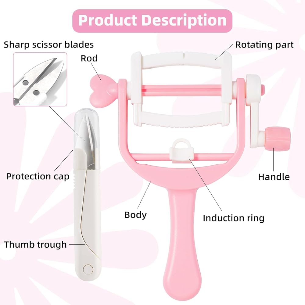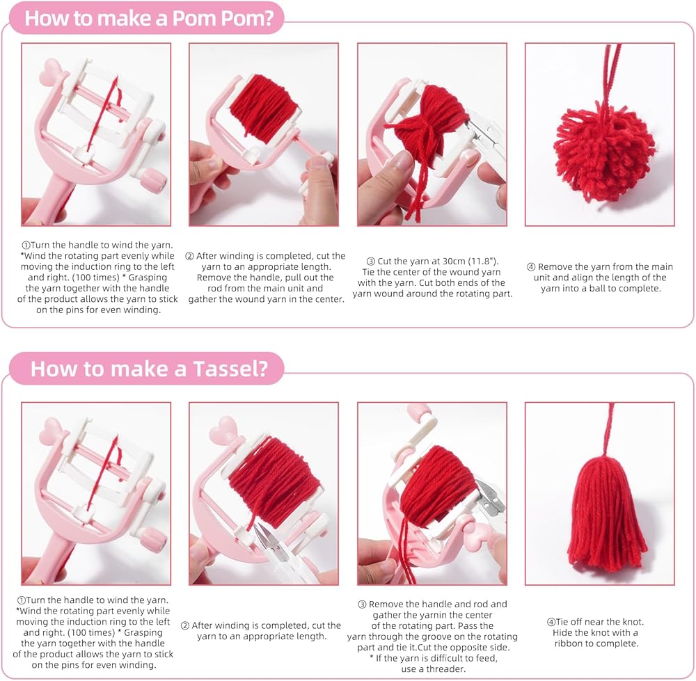 • أداة صنع بوم بوم: الجسم بأكمله لأداة صنع بوم بوم هذه مصنوع من مادة الراتنج ABS، وهي قوية ومتينة. يتم توزيع عمود اللف بالتساوي باستخدام "الأسنان"، ويوجد "قفل على شكل حرف U" في الجزء السفلي من أداة صنع بوم بوم. يتحرك دليل الخيط إلى اليسار واليمين عندما يضغط الإبهام على دليل الخيط بحيث يتم تثبيت الصوف بالتساوي على "الأسنان"، مما يجعل من السهل صنع الكريات والشرابات.