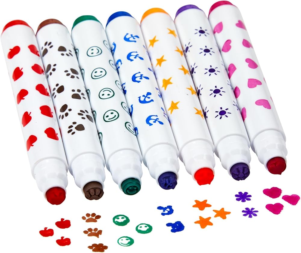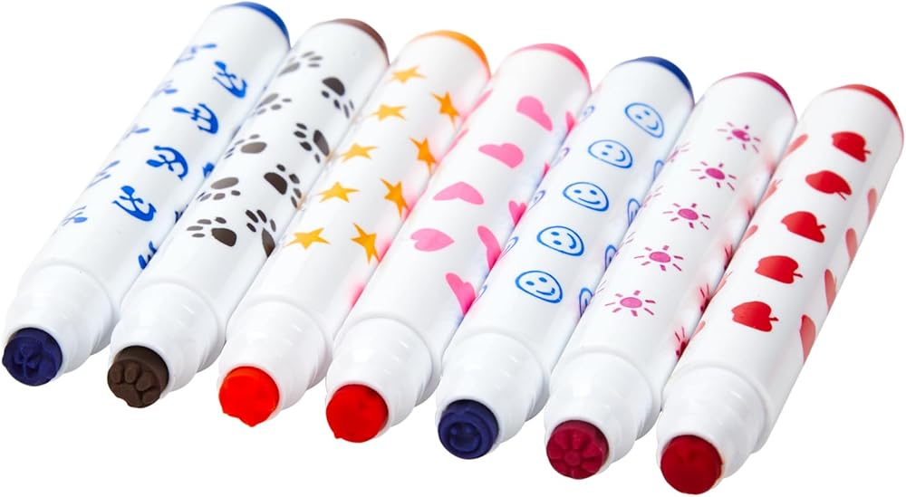 متنوعة: تحتوي أقلام التحديد على مجموعة كبيرة من التصميمات المختلفة بما في ذلك؛ 1 × مطبوعات مخالب باللون الأسود والبني، 2 × وجوه مبتسمة باللون الأزرق والأرجواني والأخضر، 2 × نجوم باللون الفيروزي والأخضر الليموني واليوسفي والأرجواني والأحمر والأزرق، 1 × تفاح باللون الأخضر الليموني والأخضر والأحمر، 1 × مرساة باللون الأزرق والفيروزي والأحمر، 1 × شمس باللون الأخضر الليموني والأرجواني، 2 × شمس باللون الفيروزي والبرتقالي والأرجواني والأزرق، 2 × قلوب باللون الأحمر والوردي والأرجواني والأرجواني.
