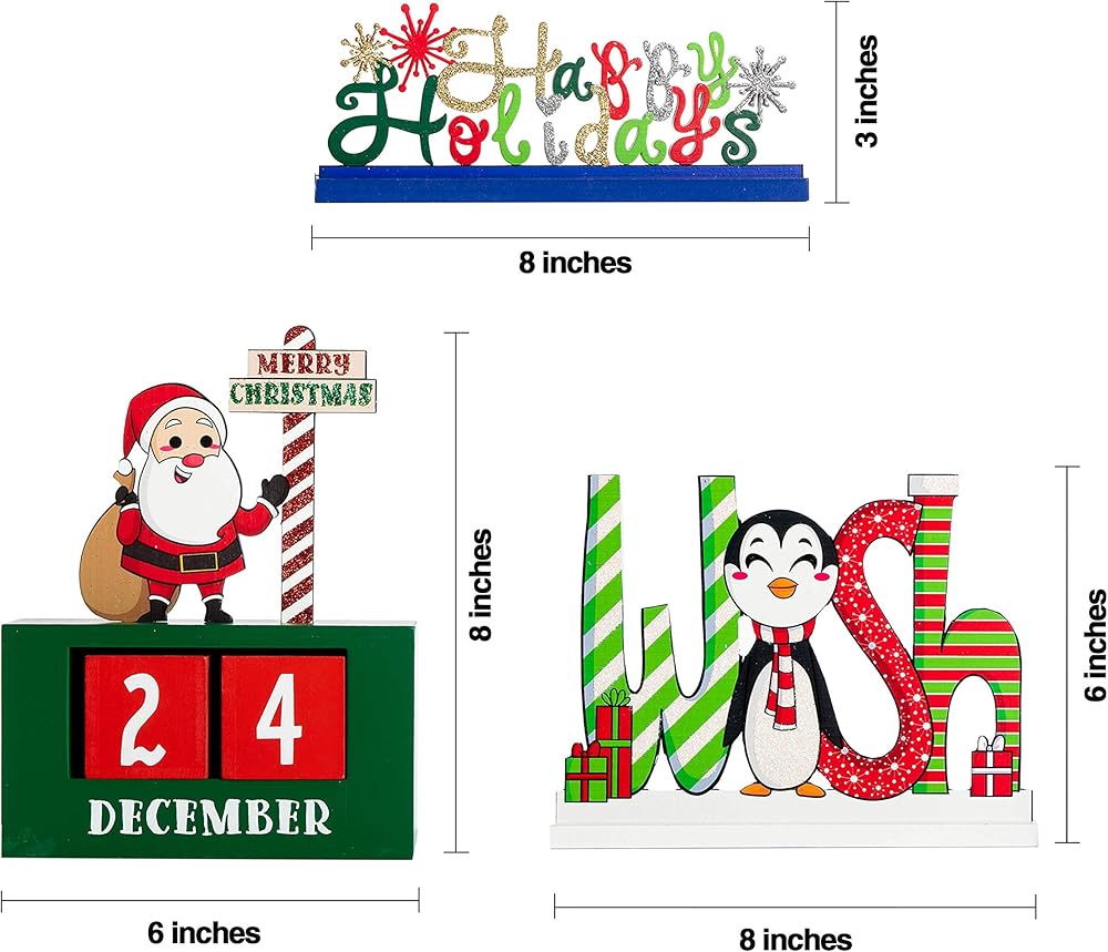 تصميم فريد من نوعه. يتضمن ديكور الكريسماس اللطيف الخاص بنا 6 شخصيات خشبية كلاسيكية للكريسماس مع قطع لامعة على كل تصميم. تأتي مع 4 شخصيات و2 تحيات للعطلة في 3 مقاسات مختلفة. 4 شخصيات - تقويم سانتا ورجل الثلج (الارتفاع 8 بوصة، العرض 6 بوصة)، الرنة، البطاريق (الارتفاع 6 بوصة، العرض 8 بوصة). 2 من التهنئة بالعطلات السعيدة وأيام السنة (الطول 7.62 سم، العرض 20.32 سم).