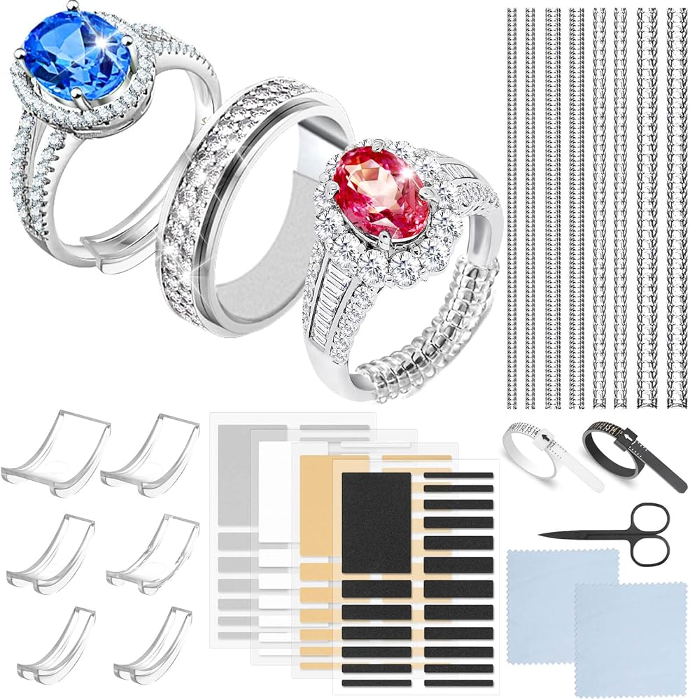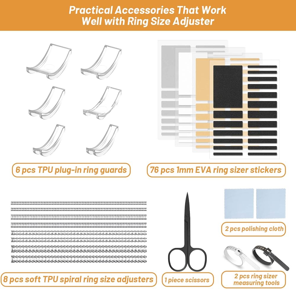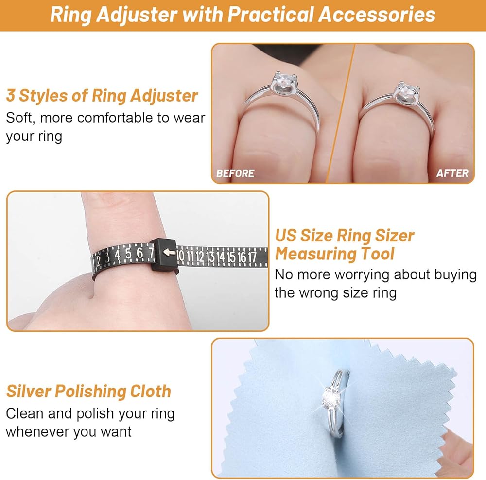 【أنماط مختلفة من مجموعة أدوات ضبط مقاس الخواتم】تتضمن العبوة 8 قطع من أداة الشد الحلزونية، و6 قطع من أدوات ضبط مقاس الحلقة غير المرئية، و4 أوراق/76 قطعة من أدوات ضبط مقاس الخواتم، وقطعتين من قماش تلميع المجوهرات، وقطعتين من أداة قياس قياس الخواتم، وقطعة واحدة من المقص وقطعة واحدة من بطاقة التعليمات.