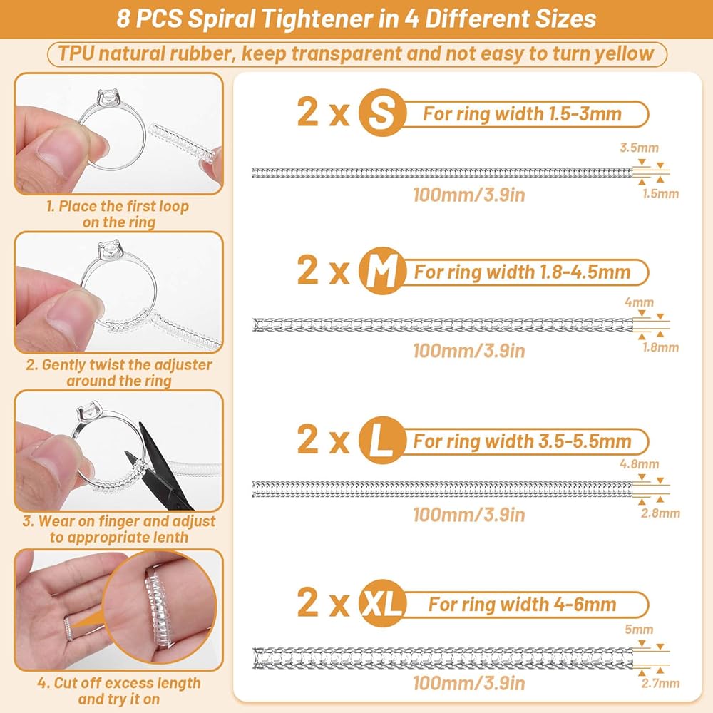 【تشغيل بسيط】لف أداة ضبط الحلقة الزنبركية عددًا معينًا من المرات على الحلقة وفقًا للحجم المطلوب وقم بقصها عندما يكون الشد صحيحًا. هناك 6 قطع من فواصل الخواتم ذات العرض المختلفة التي تلبي احتياجاتك المختلفة مع الأخذ في الاعتبار مطابقة عرض الخاتم. ضع أداة قياس الخاتم على إصبعك، ثم اربطها قليلاً، الرقم الذي يشير إليه السهم هو مقاس الخاتم المناسب.